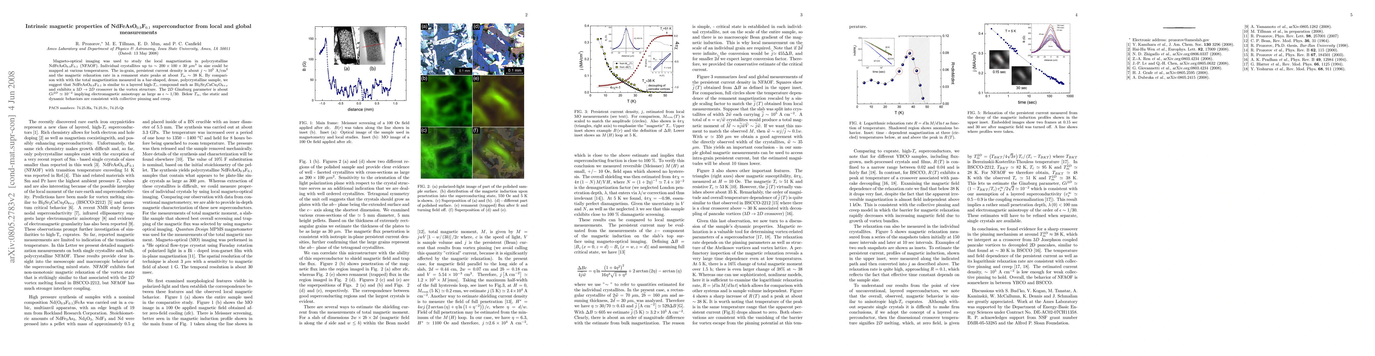This paper investigates the intrinsic magnetic properties of NdFeAsO$_{0.9}$F$_{0.1}$ superconductor using magneto-optical imaging and global measurements. It finds a persistent current density of $j\sim10^{5}$ A/cm$^{2}$ and a magnetic relaxation peak at $T_{m}\sim38$ K, suggesting a $3D\to2D$ vortex structure crossover and significant electromagnetic anisotropy.