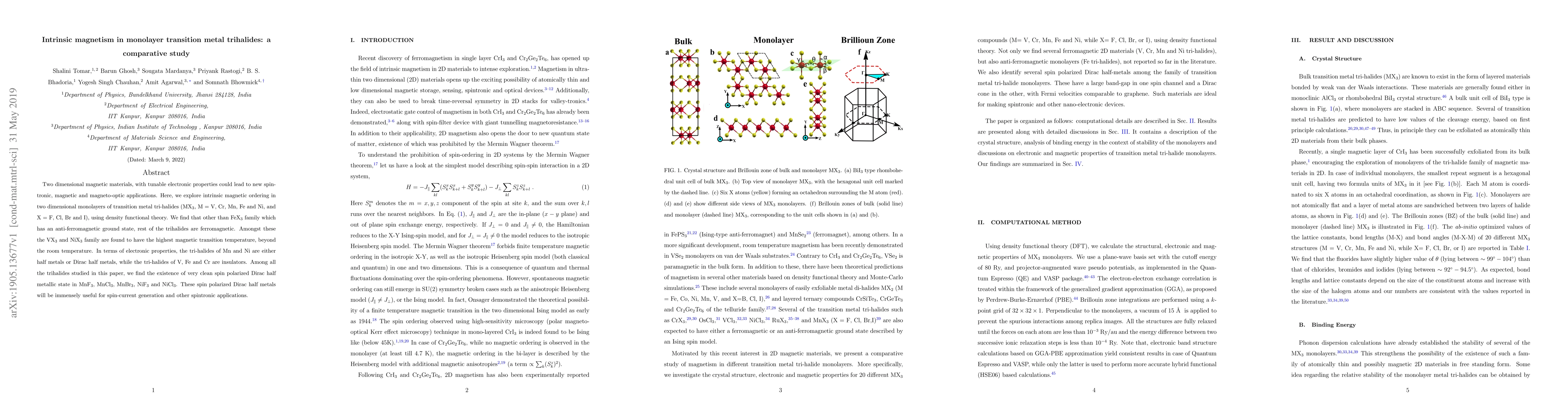 This study investigates intrinsic magnetism in monolayer transition metal trihalides (MX$_3$) using density functional theory, finding ferromagnetic ordering in most, with VX$_3$ and NiX$_3$ showing high magnetic transition temperatures above room temperature. Mn and Ni trihalides exhibit half-metallic or Dirac half-metallic states, promising for spintronic applications.