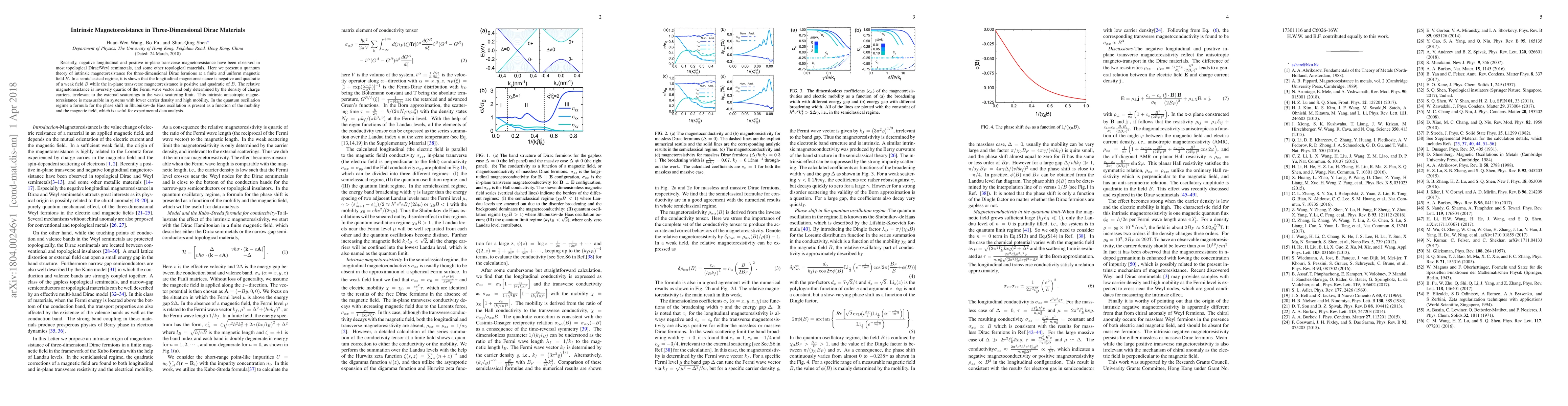 Recently, negative longitudinal and positive in-plane transverse magnetoresistance have been observed in most topological Dirac/Weyl semimetals, and some other topological materials. Here we present a quantum theory of intrinsic magnetoresistance for three-dimensional Dirac fermions at a finite and uniform magnetic field B. In a semiclassical regime, it is shown that the longitudinal magnetoresistance is negative and quadratic of a weak field B while the in-plane transverse magnetoresistance is positive and quadratic of B. The relative magnetoresistance is inversely quartic of the Fermi wave vector and only determined by the density of charge carriers, irrelevant to the external scatterings in the weak scattering limit. This intrinsic anisotropic magnetoresistance is measurable in systems with lower carrier density and high mobility. In the quantum oscillation regime a formula for the phase shift in Shubnikov-de Hass oscillation is present as a function of the mobility and the magnetic field, which is useful for experimental data analysis.