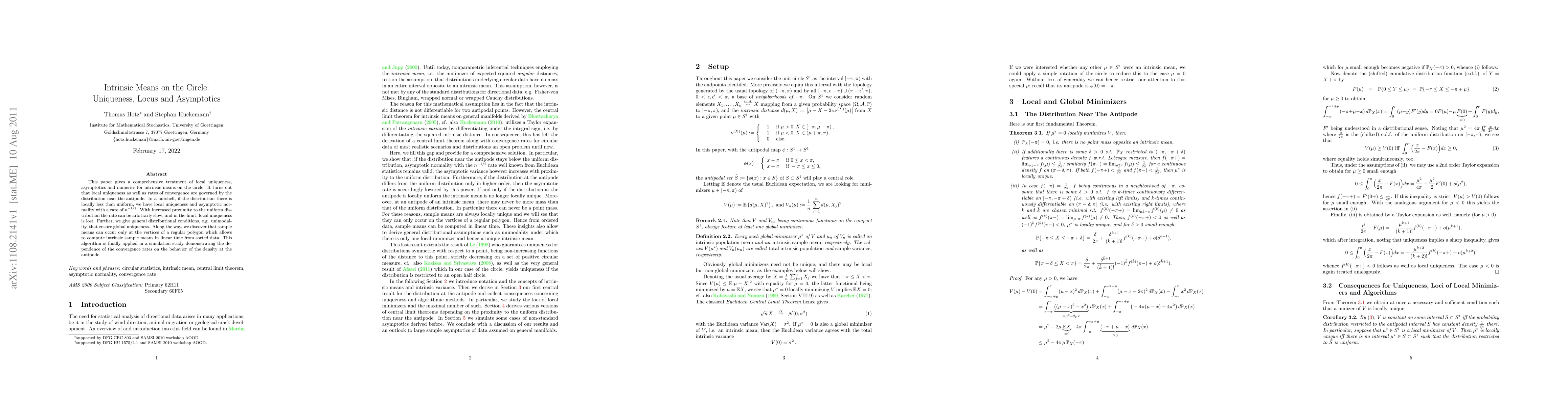 This paper gives a comprehensive treatment of local uniqueness, asymptotics and numerics for intrinsic means on the circle. It turns out that local uniqueness as well as rates of convergence are governed by the distribution near the antipode. In a nutshell, if the distribution there is locally less than uniform, we have local uniqueness and asymptotic normality with a rate of 1 / \surdn. With increased proximity to the uniform distribution the rate can be arbitrarly slow, and in the limit, local uniqueness is lost. Further, we give general distributional conditions, e.g. unimodality, that ensure global uniqueness. Along the way, we discover that sample means can occur only at the vertices of a regular polygon which allows to compute intrinsic sample means in linear time from sorted data. This algorithm is finally applied in a simulation study demonstrating the dependence of the convergence rates on the behavior of the density at the antipode.