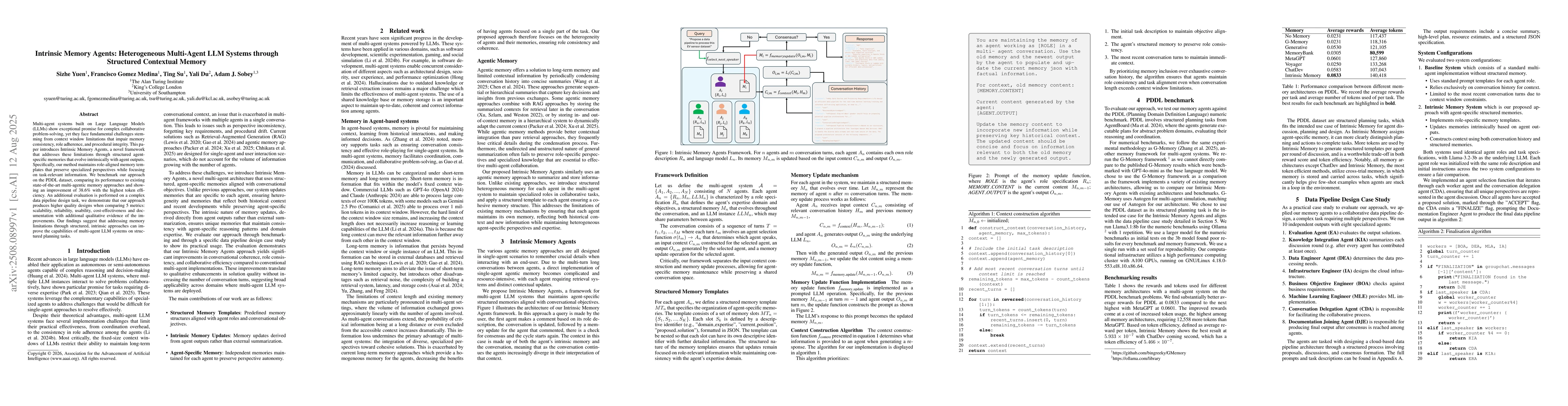 Multi-agent systems built on Large Language Models (LLMs) show exceptional promise for complex collaborative problem-solving, yet they face fundamental challenges stemming from context window limitations that impair memory consistency, role adherence, and procedural integrity. This paper introduces Intrinsic Memory Agents, a novel framework that addresses these limitations through structured agent-specific memories that evolve intrinsically with agent outputs. Specifically, our method maintains role-aligned memory templates that preserve specialized perspectives while focusing on task-relevant information. We benchmark our approach on the PDDL dataset, comparing its performance to existing state-of-the-art multi-agentic memory approaches and showing an improvement of 38.6\% with the highest token efficiency. An additional evaluation is performed on a complex data pipeline design task, we demonstrate that our approach produces higher quality designs when comparing 5 metrics: scalability, reliability, usability, cost-effectiveness and documentation with additional qualitative evidence of the improvements. Our findings suggest that addressing memory limitations through structured, intrinsic approaches can improve the capabilities of multi-agent LLM systems on structured planning tasks.
