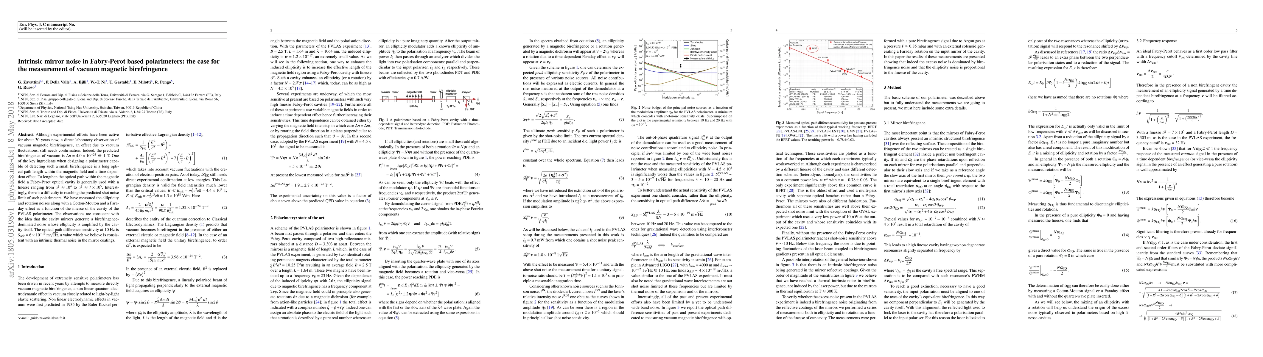 Although experimental efforts have been active for about 30 years now, a direct laboratory observation of vacuum magnetic birefringence, an effect due to vacuum fluctuations, still needs confirmation. Indeed, the predicted birefringence of vacuum is $\Delta n = 4.0\times 10^{-24}$ @ 1~T. One of the key ingredients when designing a polarimeter capable of detecting such a small birefringence is a long optical path length within the magnetic field and a time dependent effect. To lengthen the optical path within the magnetic field a Fabry-Perot optical cavity is generally used with a finesse ranging from ${\cal F} \approx 10^4$ to ${\cal F} \approx7\times 10^5$. Interestingly, there is a difficulty in reaching the predicted shot noise limit of such polarimeters. We have measured the ellipticity and rotation noises along with a Cotton-Mouton and a Faraday effect as a function of the finesse of the cavity of the PVLAS polarimeter. The observations are consistent with the idea that the cavity mirrors generate a birefringence-dominated noise whose ellipticity is amplified by the cavity itself. The optical path difference sensitivity at $10\;$Hz is $S_{\Delta{\cal D}}=6\times 10^{-19}\;$m$/\sqrt{\rm Hz}$, a value which we believe is consistent with an intrinsic thermal noise in the mirror coatings.