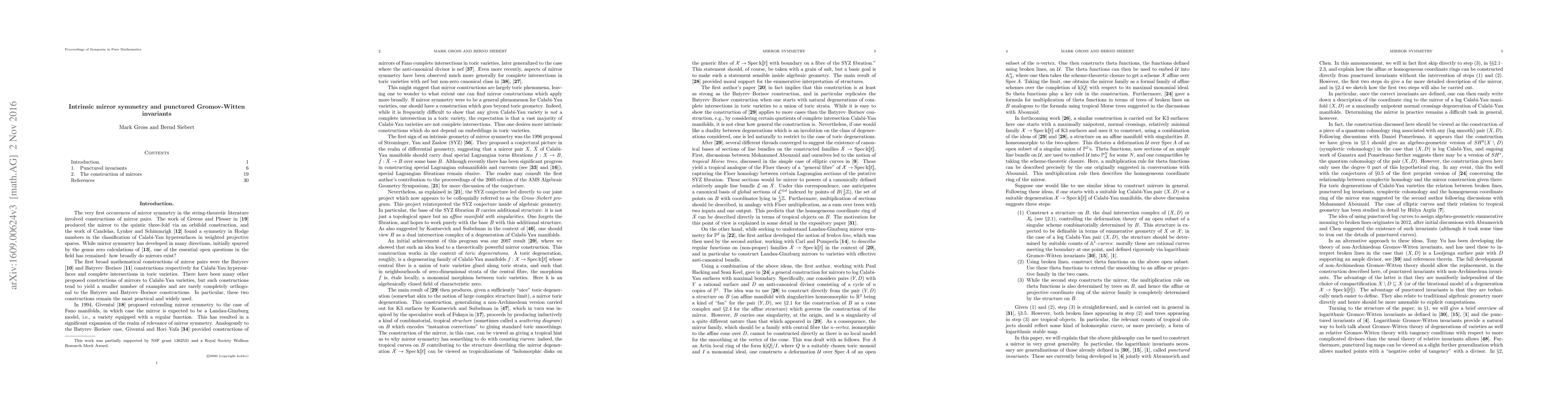 This contribution to the 2015 AMS Summer Institute in Algebraic Geometry (Salt Lake City) announces a general mirror construction. This construction applies to log Calabi-Yau pairs (X,D) with maximal boundary D or to maximally unipotent degenerations of Calabi-Yau manifolds. The new ingredient is a notion of "punctured Gromov-Witten invariant", currently in progress with Abramovich and Chen. The mirror to a pair (X,D) is constructed as the spectrum of a ring defined using the punctured invariants of (X,D). An analogous construction leads to mirrors of Calabi-Yau manifolds. This can be viewed as a generalization of constructions developed jointly with Hacking and Keel in the case of log CY surfaces and K3 surfaces.