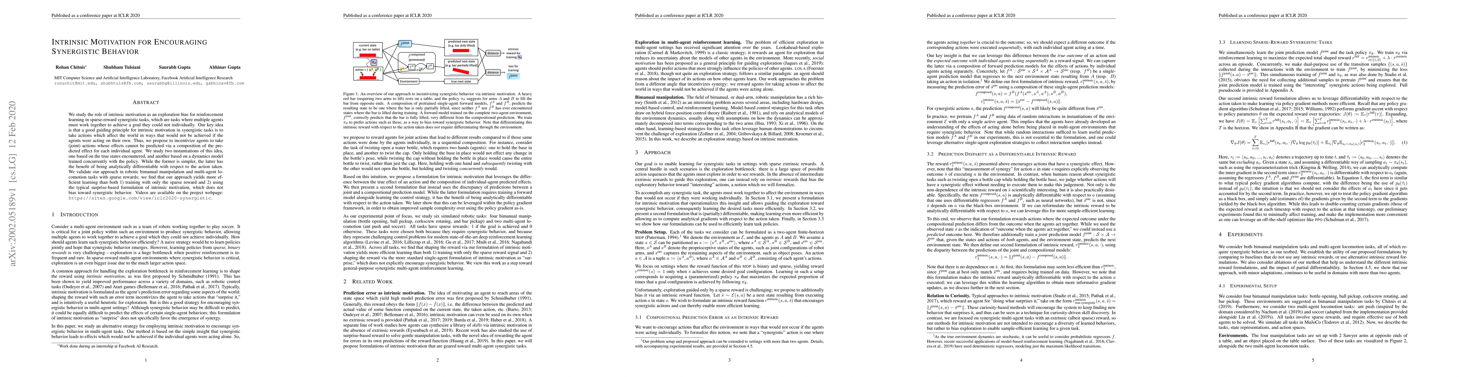 We study the role of intrinsic motivation as an exploration bias for reinforcement learning in sparse-reward synergistic tasks, which are tasks where multiple agents must work together to achieve a goal they could not individually. Our key idea is that a good guiding principle for intrinsic motivation in synergistic tasks is to take actions which affect the world in ways that would not be achieved if the agents were acting on their own. Thus, we propose to incentivize agents to take (joint) actions whose effects cannot be predicted via a composition of the predicted effect for each individual agent. We study two instantiations of this idea, one based on the true states encountered, and another based on a dynamics model trained concurrently with the policy. While the former is simpler, the latter has the benefit of being analytically differentiable with respect to the action taken. We validate our approach in robotic bimanual manipulation and multi-agent locomotion tasks with sparse rewards; we find that our approach yields more efficient learning than both 1) training with only the sparse reward and 2) using the typical surprise-based formulation of intrinsic motivation, which does not bias toward synergistic behavior. Videos are available on the project webpage: https://sites.google.com/view/iclr2020-synergistic.