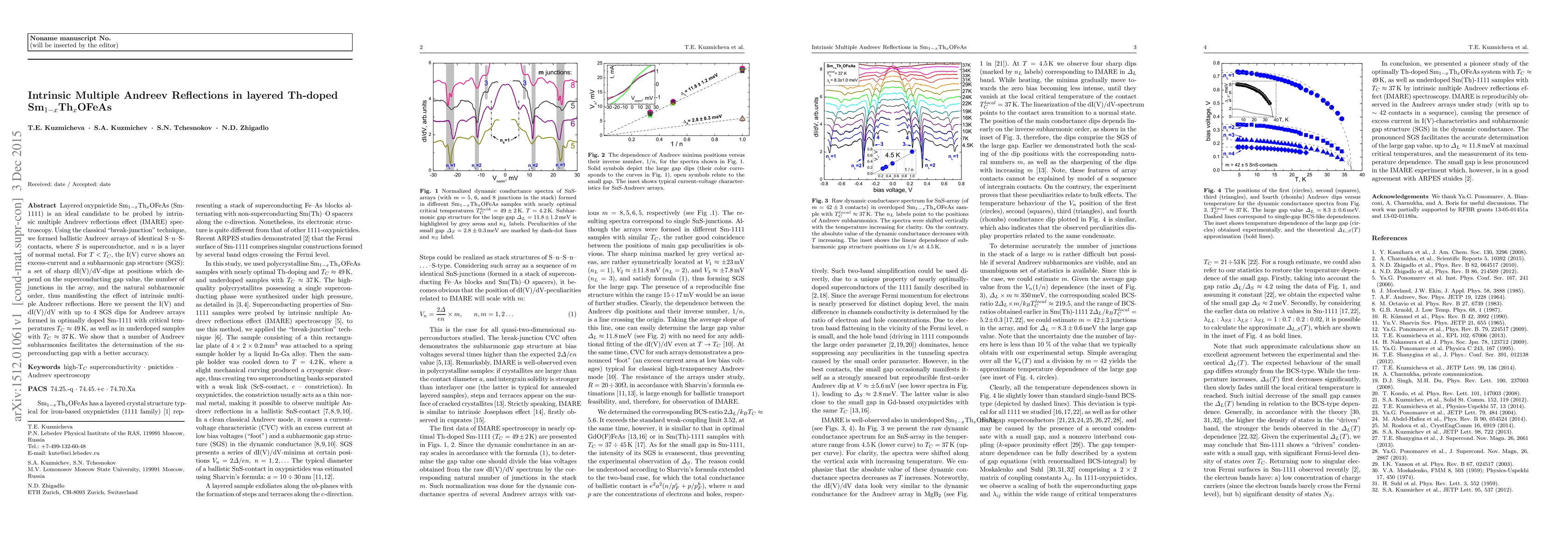 Layered oxypnictide Sm$_{1-x}$Th$_x$OFeAs (Sm-1111) is an ideal candidate to be probed by intrinsic multiple Andreev reflections effect (IMARE) spectroscopy. Using the classical "break-junction" technique, we formed ballistic Andreev arrays of identical S--n--S-contacts, where $S$ is superconductor, and $n$ is a layer of normal metal. For $T < T_C$, the I(V) curve shows an excess-current and a subharmonic gap structure (SGS): a set of sharp dI(V)/dV-dips at positions which depend on the superconducting gap value, the number of junctions in the array, and the natural subharmonic order, thus manifesting the effect of intrinsic multiple Andreev reflections. Here we present the I(V) and dI(V)/dV with up to 4 SGS dips for Andreev arrays formed in optimally doped Sm-1111 with critical temperatures $T_C \approx 49$\,K, as well as in underdoped samples with $T_C \approx 37$\,K. We show that a number of Andreev subharmonics facilitates the determination of the superconducting gap with a better accuracy.