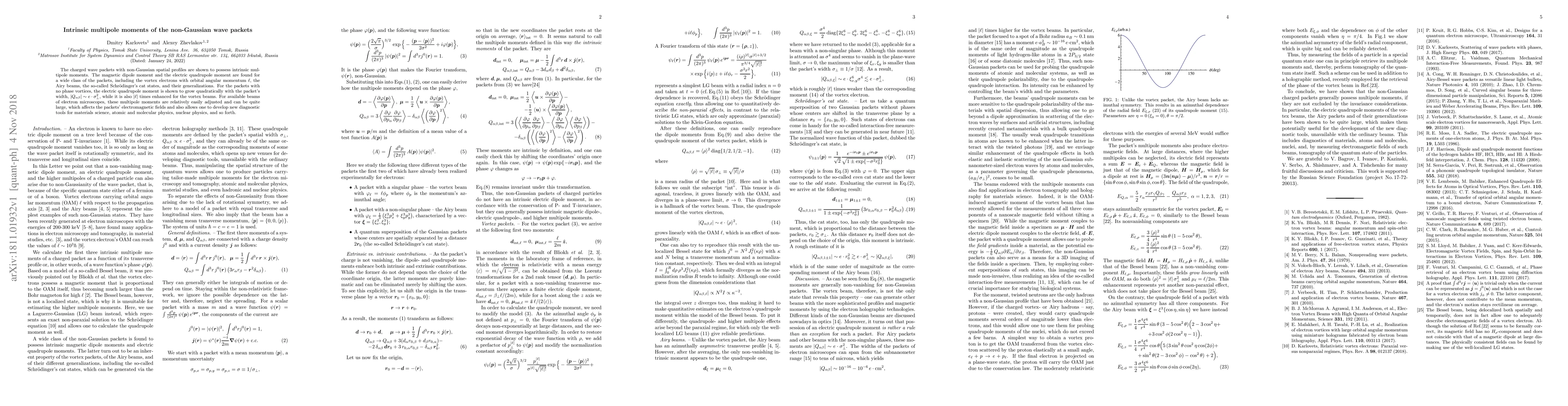 The charged wave packets with non-Gaussian spatial profiles are shown to possess intrinsic multipole moments. The magnetic dipole moment and the electric quadrupole moment are found for a wide class of the packets, including the vortex electrons with orbital angular momentum $\ell$, the Airy beams, the so-called Schr\"odinger's cat states, and their generalizations. For the packets with no phase vortices, the electric quadrupole moment is shown to grow quadratically with the packet's width, $|Q_{\alpha\beta}| \sim e\cdot \sigma_{\perp}^2$, while it is also $|\ell|$ times enhanced for the vortex beams. For available beams of electron microscopes, these multipole moments are relatively easily adjusted and can be quite large, which affects the packets' electromagnetic fields and also allows one to develop new diagnostic tools for materials science, atomic and molecular physics, nuclear physics, and so forth.