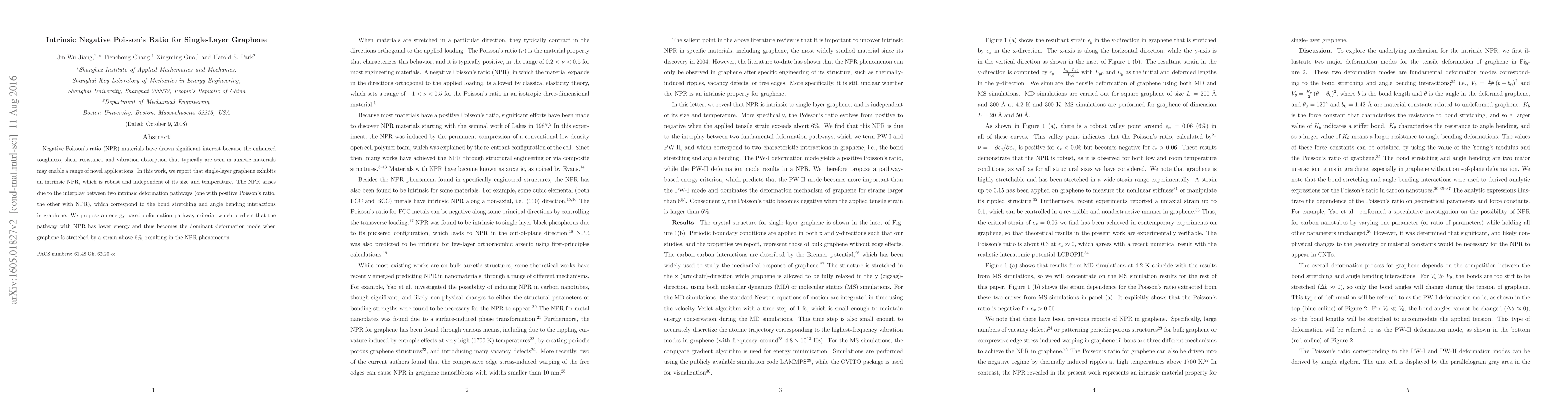 Single-layer graphene demonstrates an intrinsic negative Poisson's ratio, a robust property independent of size and temperature, arising from the interplay between bond stretching and angle bending deformation pathways. The energy-based deformation pathway criteria predict that the lower energy angle bending pathway dominates above 6% strain, leading to the observed negative Poisson's ratio.