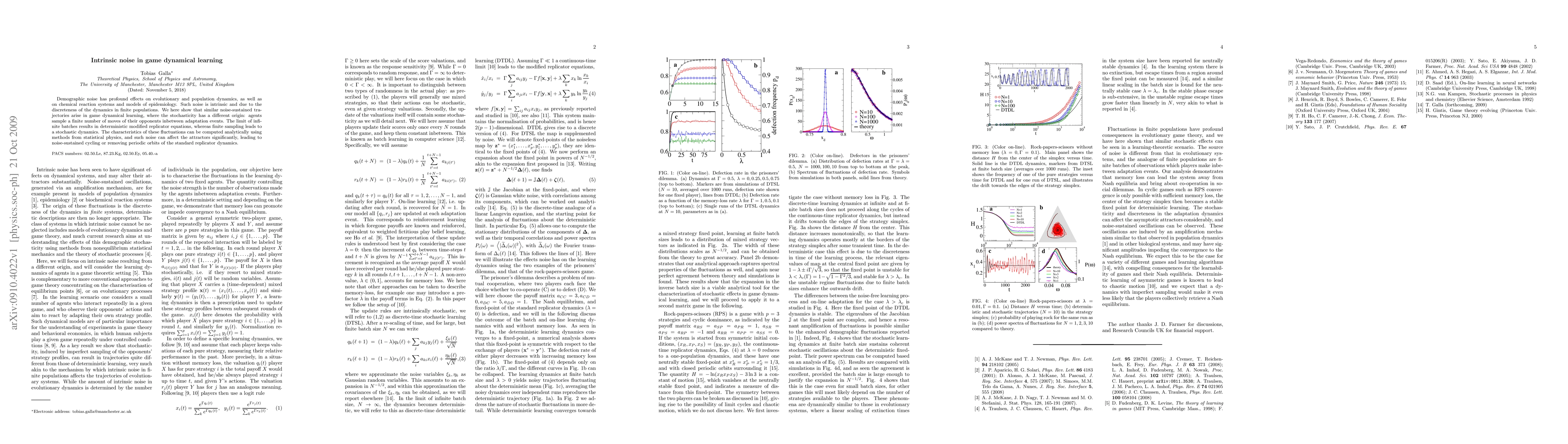 Demographic noise has profound effects on evolutionary and population dynamics, as well as on chemical reaction systems and models of epidemiology. Such noise is intrinsic and due to the discreteness of the dynamics in finite populations. We here show that similar noise-sustained trajectories arise in game dynamical learning, where the stochasticity has a different origin: agents sample a finite number of moves of their opponents in-between adaptation events. The limit of infinite batches results in deterministic modified replicator equations, whereas finite sampling leads to a stochastic dynamics. The characteristics of these fluctuations can be computed analytically using methods from statistical physics, and such noise can affect the attractors significantly, leading to noise-sustained cycling or removing periodic orbits of the standard replicator dynamics.