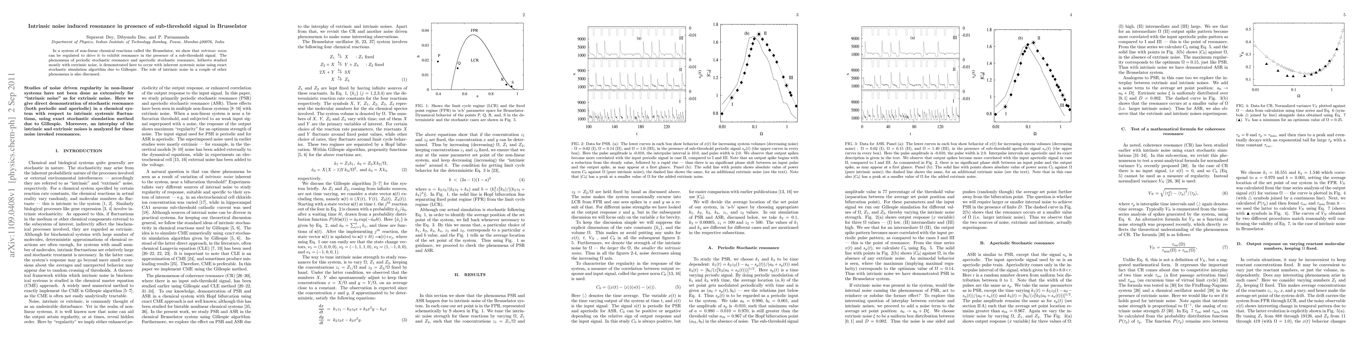 In a system of non-linear chemical reactions called the Brusselator, we show that {\it intrinsic noise} can be regulated to drive it to exhibit resonance in the presence of a sub-threshold signal. The phenomena of periodic stochastic resonance and aperiodic stochastic resonance, hitherto studied mostly with extrinsic noise, is demonstrated here to occur with inherent systemic noise using exact stochastic simulation algorithm due to Gillespie. The role of intrinsic noise in a couple of other phenomena is also discussed.