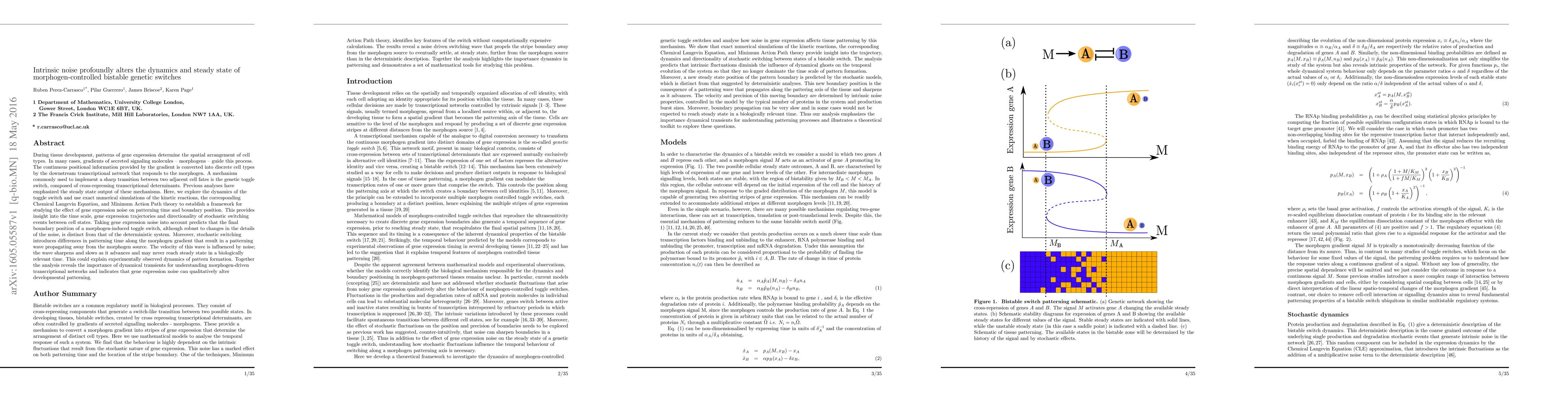 This paper investigates how intrinsic gene expression noise affects the dynamics and steady state of bistable genetic switches controlled by morphogens during tissue development. It finds that noise alters patterning time and boundary position, leading to a propagating patterning wave that sharpens and slows over time, potentially explaining observed developmental dynamics.