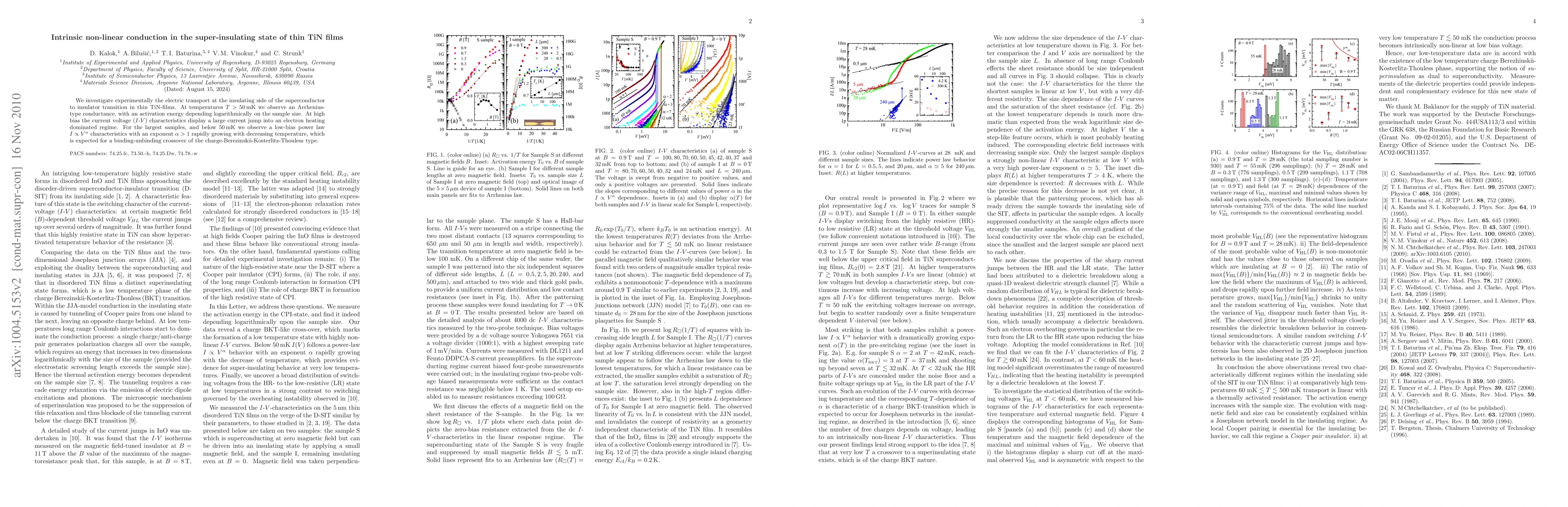 We investigate experimentally the electric transport at the insulating side of the superconductor to insulator transition in thin TiN-films. At temperatures T > 50 mK we observe an Arrhenius-type conductance, with an activation energy depending logarithmically on the sample size. At high bias the current voltage (I-V) characteristics display a large current jump into an electron heating dominated regime. For the largest samples, and below 50 mK we observe a low-bias power law I ~ V^alpha characteristics with an exponent alpha > 1 rapidly growing with decreasing temperature, which is expected for a binding-unbinding crossover of the charge-Berezinskii-Kosterlitz-Thouless type.