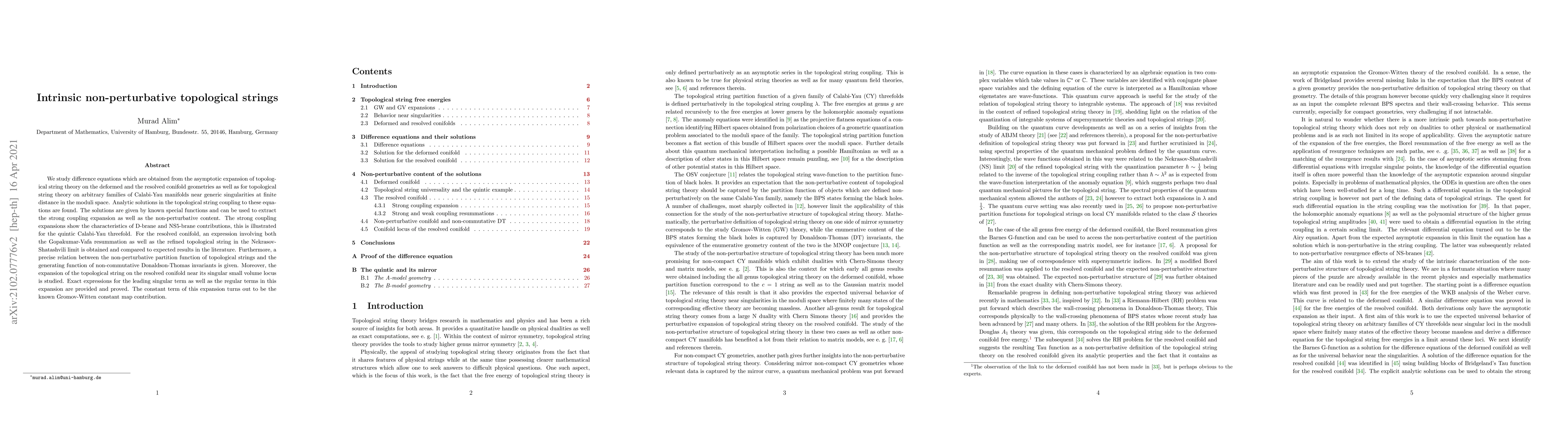 We study difference equations which are obtained from the asymptotic expansion of topological string theory on the deformed and the resolved conifold geometries as well as for topological string theory on arbitrary families of Calabi-Yau manifolds near generic singularities at finite distance in the moduli space. Analytic solutions in the topological string coupling to these equations are found. The solutions are given by known special functions and can be used to extract the strong coupling expansion as well as the non-perturbative content. The strong coupling expansions show the characteristics of D-brane and NS5-brane contributions, this is illustrated for the quintic Calabi-Yau threefold. For the resolved conifold, an expression involving both the Gopakumar-Vafa resummation as well as the refined topological string in the Nekrasov-Shatashvili limit is obtained and compared to expected results in the literature. Furthermore, a precise relation between the non-perturbative partition function of topological strings and the generating function of non-commutative Donaldson-Thomas invariants is given. Moreover, the expansion of the topological string on the resolved conifold near its singular small volume locus is studied. Exact expressions for the leading singular term as well as the regular terms in this expansion are provided and proved. The constant term of this expansion turns out to be the known Gromov-Witten constant map contribution.