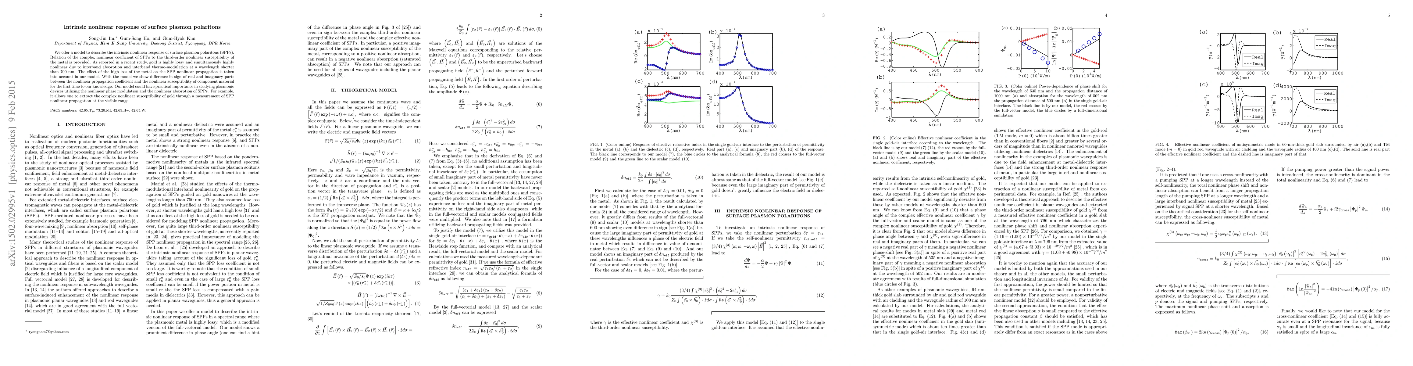 This research develops a model to describe the intrinsic nonlinear response of surface plasmon polaritons (SPPs), linking their complex nonlinear coefficient to the metal's third-order nonlinear susceptibility. It highlights gold's unique properties of high loss and nonlinearity, and reveals a difference in sign between the real and imaginary parts of the nonlinear propagation coefficient and material susceptibility.