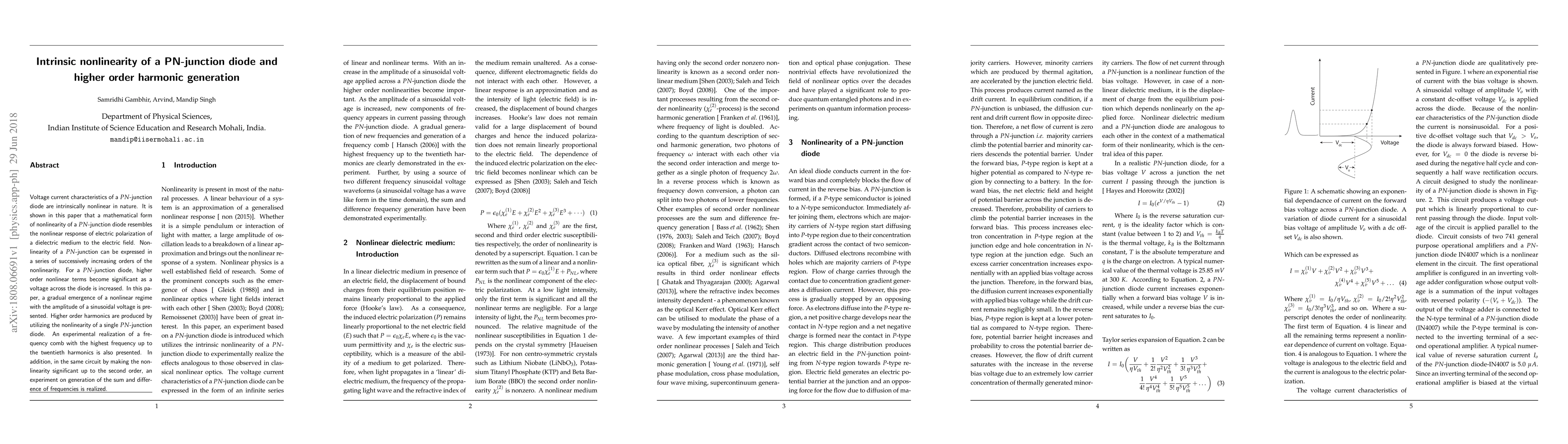 This paper investigates the intrinsic nonlinearity of a PN-junction diode, demonstrating how higher order harmonic generation arises from its nonlinear voltage-current characteristics. Experimental results show the generation of up to the twentieth harmonic and frequency sum/difference using the diode's nonlinear response.