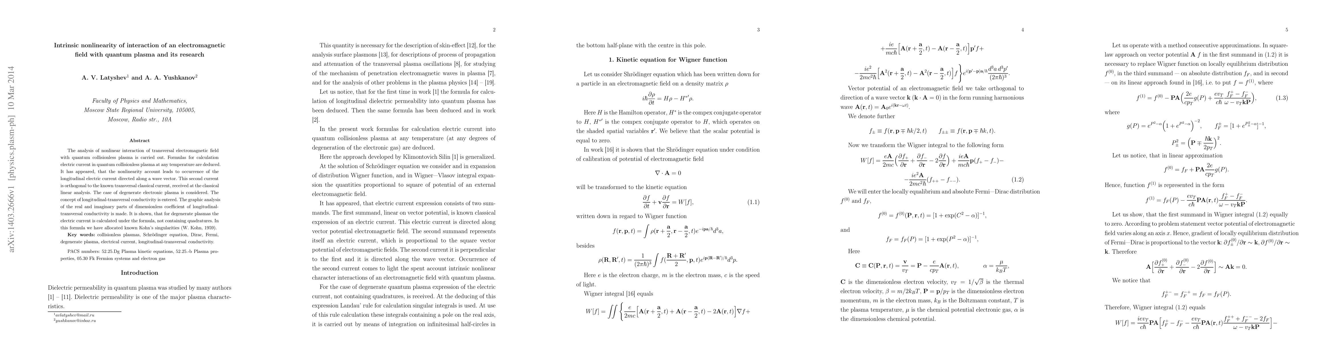 The analysis of nonlinear interaction of transversal electromagnetic field with quantum collisionless plasma is carried out. Formulas for calculation electric current in quantum collisionless plasma at any temperature are deduced. It has appeared, that the nonlinearity account leads to occurrence of the longitudinal electric current directed along a wave vector. This second current is orthogonal to the known transversal classical current, received at the classical linear analysis. The case of degenerate electronic plasma is considered. The concept of longitudinal-transversal conductivity is entered. The graphic analysis of the real and imaginary parts of dimensionless coefficient of longitudinal-transversal conductivity is made. It is shown, that for degenerate plasmas the electric current is calculated under the formula, not containing quadratures. In this formula we have allocated known Kohn's singularities (W. Kohn, 1959).