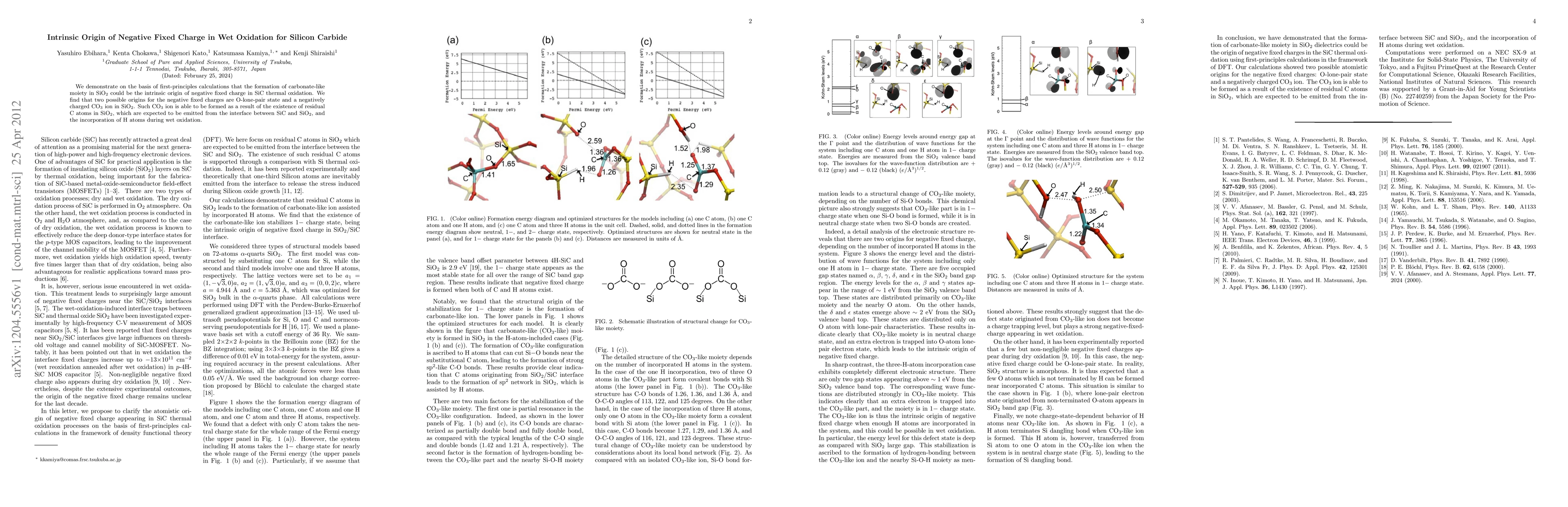 This paper uses first-principles calculations to identify the intrinsic origin of negative fixed charge in SiC thermal oxidation, attributing it to the formation of a carbonate-like moiety in SiO$_2$. The study finds that negative fixed charges arise from O-lone-pair states and negatively charged CO$_3$ ions, formed by residual C atoms and H atoms during wet oxidation.