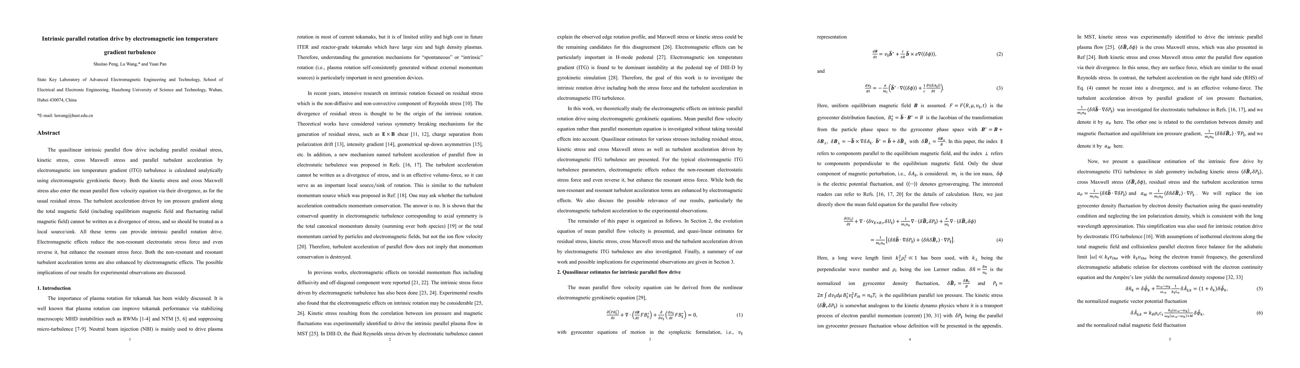 This paper analytically calculates the intrinsic parallel flow drive due to electromagnetic ion temperature gradient turbulence using gyrokinetic theory, revealing contributions from kinetic and Maxwell stresses. Electromagnetic effects modify these stresses and enhance turbulent acceleration, suggesting implications for observed plasma rotation.
