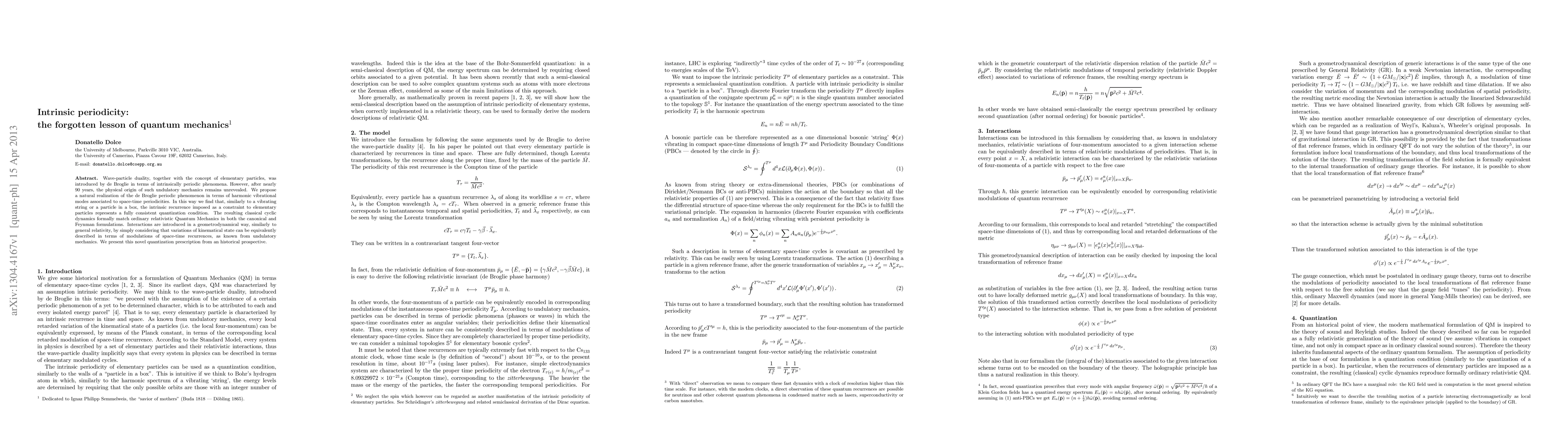 Wave-particle duality, together with the concept of elementary particles, was introduced by de Broglie in terms of intrinsically "periodic phenomena". However, after nearly 90 years, the physical origin of such undulatory mechanics remains unrevealed. We propose a natural realization of the de Broglie "periodic phenomenon" in terms of harmonic vibrational modes associated to space-time periodicities. In this way we find that, similarly to a vibrating string or a particle in a box, the intrinsic recurrence imposed as a constraint to elementary particles represents a fully consistent quantization condition. The resulting classical cyclic dynamics formally match ordinary relativistic Quantum Mechanics in both the canonical and Feynman formulations. Interactions are introduced in a geometrodynamical way, similarly to general relativity, by simply considering that variations of kinematical state can be equivalently described in terms of modulations of space-time recurrences, as known from undulatory mechanics. We present this novel quantization prescription from a historical prospective.