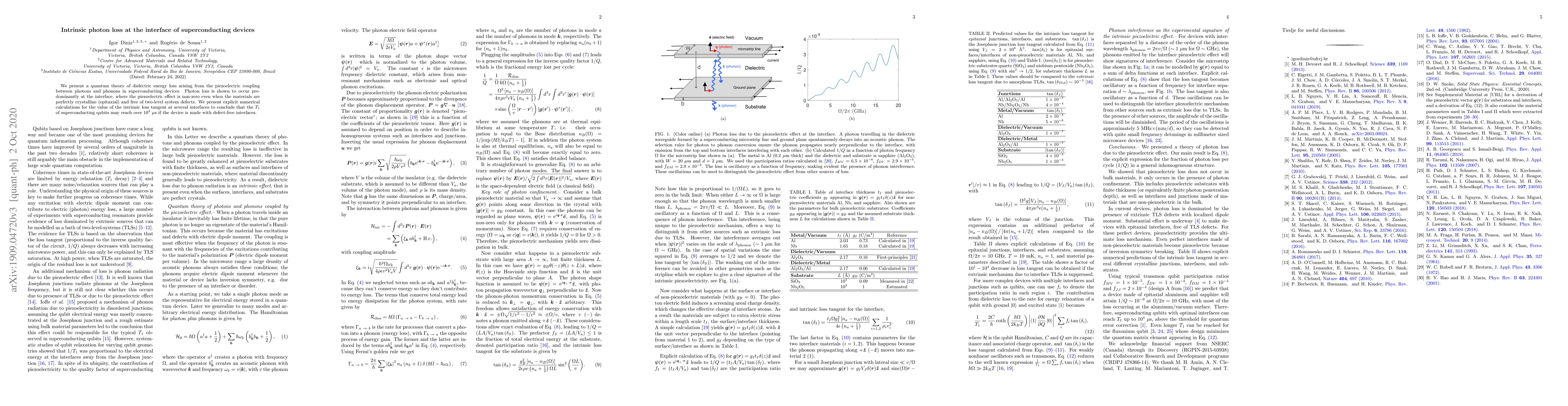 We present a quantum theory of dielectric energy loss arising from the piezoelectric coupling between photons and phonons in superconducting devices. Photon loss is shown to occur predominantly at the interface, where the piezoelectric effect is non-zero even when the materials are perfectly crystalline (epitaxial) and free of two-level system defects. We present explicit numerical calculations for the value of the intrinsic loss tangent at several interfaces to conclude that the $T_1$ of superconducting qubits may reach $10^{4}$ $\mu$s if the device is made with defect-free interfaces.