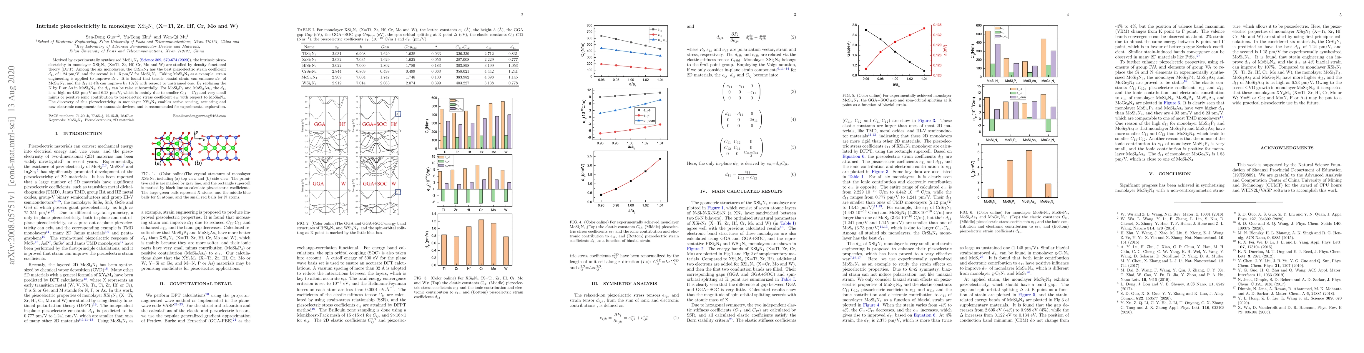 Motived by experimentally synthesized $\mathrm{MoSi_2N_4}$ (\textcolor[rgb]{0.00,0.00,1.00}{Science 369, 670-674 (2020})), the intrinsic piezoelectricity in monolayer $\mathrm{XSi_2N_4}$ (X=Ti, Zr, Hf, Cr, Mo and W) are studied by density functional theory (DFT). Among the six monolayers, the $\mathrm{CrSi_2N_4}$ has the best piezoelectric strain coefficient $d_{11}$ of 1.24 pm/V, and the second is 1.15 pm/V for $\mathrm{MoSi_2N_4}$. Taking $\mathrm{MoSi_2N_4}$ as a example, strain engineering is applied to improve $d_{11}$. It is found that tensile biaxial strain can enhance $d_{11}$ of $\mathrm{MoSi_2N_4}$, and the $d_{11}$ at 4\% can improve by 107\% with respect to unstrained one. By replacing the N by P or As in $\mathrm{MoSi_2N_4}$, the $d_{11}$ can be raise substantially. For $\mathrm{MoSi_2P_4}$ and $\mathrm{MoSi_2As_4}$, the $d_{11}$ is as high as 4.93 pm/V and 6.23 pm/V, which is mainly due to smaller $C_{11}-C_{12}$ and very small minus or positive ionic contribution to piezoelectric stress coefficient $e_{11}$ with respect to $\mathrm{MoSi_2N_4}$. The discovery of this piezoelectricity in monolayer $\mathrm{XSi_2N_4}$ enables active sensing, actuating and new electronic components for nanoscale devices, and is recommended for experimental exploration.