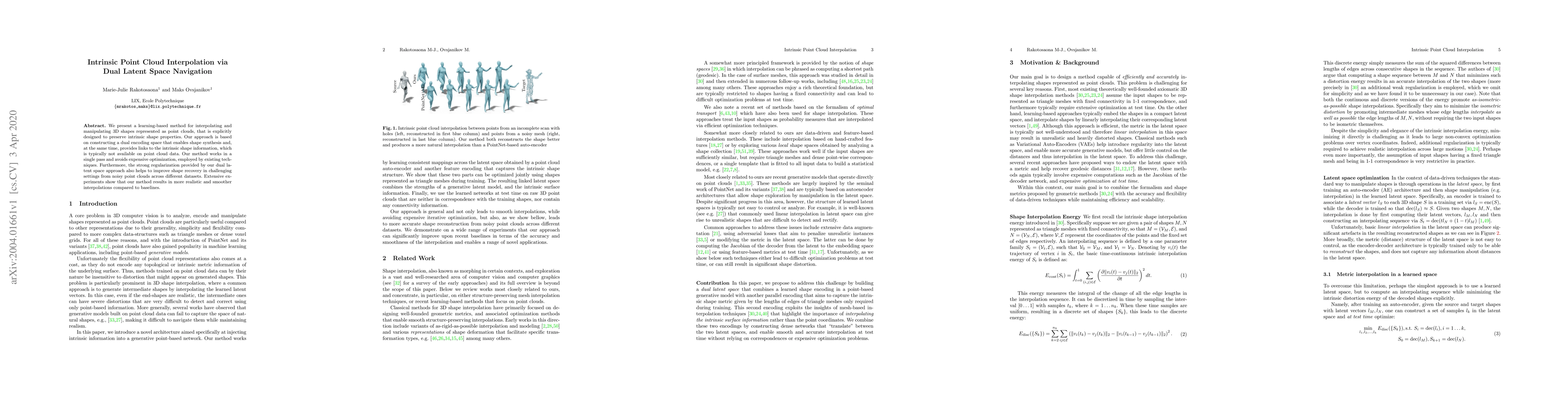 We present a learning-based method for interpolating and manipulating 3D shapes represented as point clouds, that is explicitly designed to preserve intrinsic shape properties. Our approach is based on constructing a dual encoding space that enables shape synthesis and, at the same time, provides links to the intrinsic shape information, which is typically not available on point cloud data. Our method works in a single pass and avoids expensive optimization, employed by existing techniques. Furthermore, the strong regularization provided by our dual latent space approach also helps to improve shape recovery in challenging settings from noisy point clouds across different datasets. Extensive experiments show that our method results in more realistic and smoother interpolations compared to baselines.