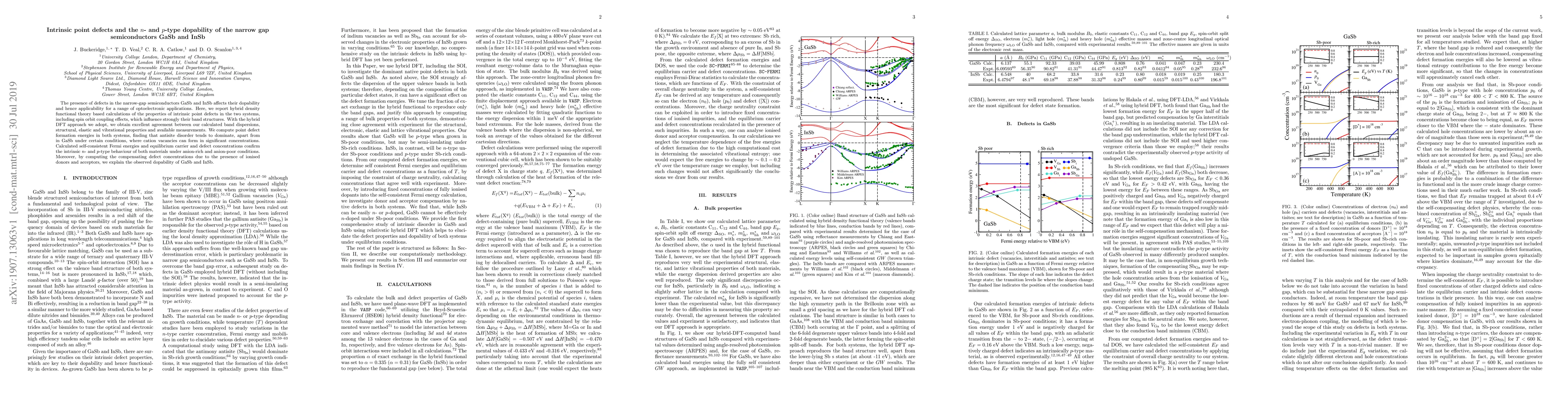 The presence of defects in the narrow-gap semiconductors GaSb and InSb affects their dopability and hence applicability for a range of optoelectronic applications. Here, we report hybrid density functional theory based calculations of the properties of intrinsic point defects in the two systems, including spin orbit coupling effects, which influence strongly their band structures. With the hybrid DFT approach we adopt, we obtain excellent agreement between our calculated band dispersions, structural, elastic and vibrational properties and available measurements. We compute point defect formation energies in both systems, finding that antisite disorder tends to dominate, apart from in GaSb under certain conditions, where cation vacancies can form in significant concentrations. Calculated self-consistent Fermi energies and equilibrium carrier and defect concentrations confirm the intrinsic $n$- and $p$-type behaviour of both materials under anion-rich and anion-poor conditions. Moreover, by computing the compensating defect concentrations due to the presence of ionised donors and acceptors, we explain the observed dopability of GaSb and InSb.