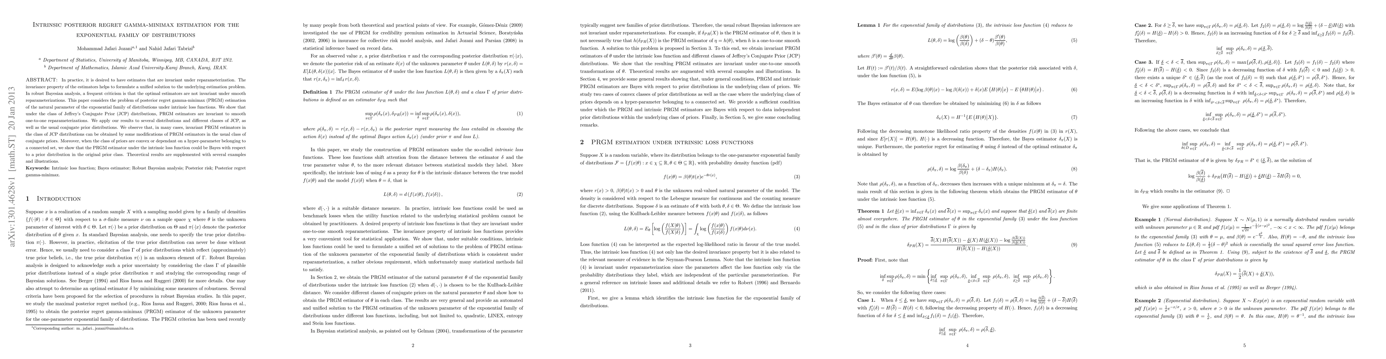This paper proposes intrinsic posterior regret gamma-minimax (PRGM) estimators for the natural parameter of exponential family distributions, ensuring invariance under smooth reparameterizations. The authors demonstrate that PRGM estimators under Jeffrey's Conjugate Prior (JCP) distributions maintain this invariance and can often be derived from modifications of PRGM estimators using usual conjugate priors.