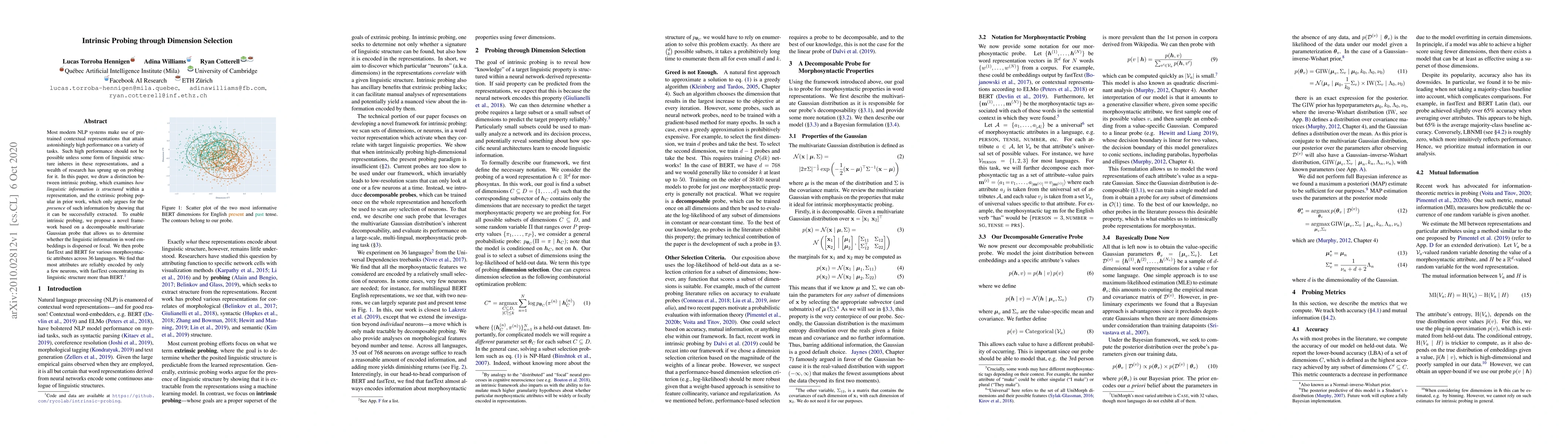 Most modern NLP systems make use of pre-trained contextual representations that attain astonishingly high performance on a variety of tasks. Such high performance should not be possible unless some form of linguistic structure inheres in these representations, and a wealth of research has sprung up on probing for it. In this paper, we draw a distinction between intrinsic probing, which examines how linguistic information is structured within a representation, and the extrinsic probing popular in prior work, which only argues for the presence of such information by showing that it can be successfully extracted. To enable intrinsic probing, we propose a novel framework based on a decomposable multivariate Gaussian probe that allows us to determine whether the linguistic information in word embeddings is dispersed or focal. We then probe fastText and BERT for various morphosyntactic attributes across 36 languages. We find that most attributes are reliably encoded by only a few neurons, with fastText concentrating its linguistic structure more than BERT.