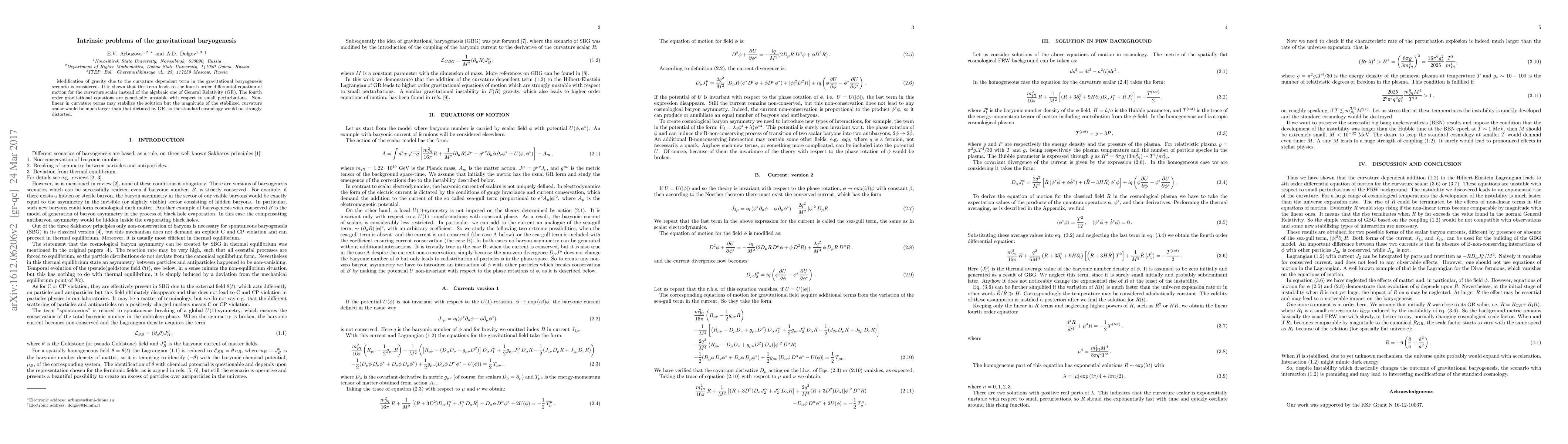 This paper examines the intrinsic problems of gravitational baryogenesis, showing that the curvature-dependent term modifies gravity and leads to fourth-order differential equations for the curvature scalar, which are inherently unstable. While non-linear terms may stabilize the solution, they would result in a significantly larger curvature scalar, thereby distorting standard cosmology.