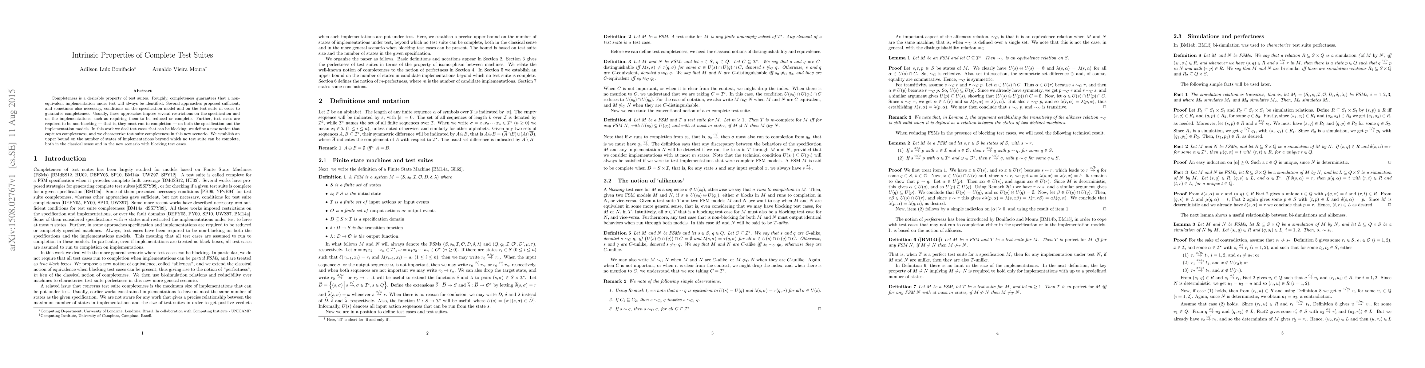 The paper defines a new notion of completeness for test suites that accommodates blocking test cases and characterizes test suite completeness in this context, establishing an upper bound on the size of implementations that can be tested completely.