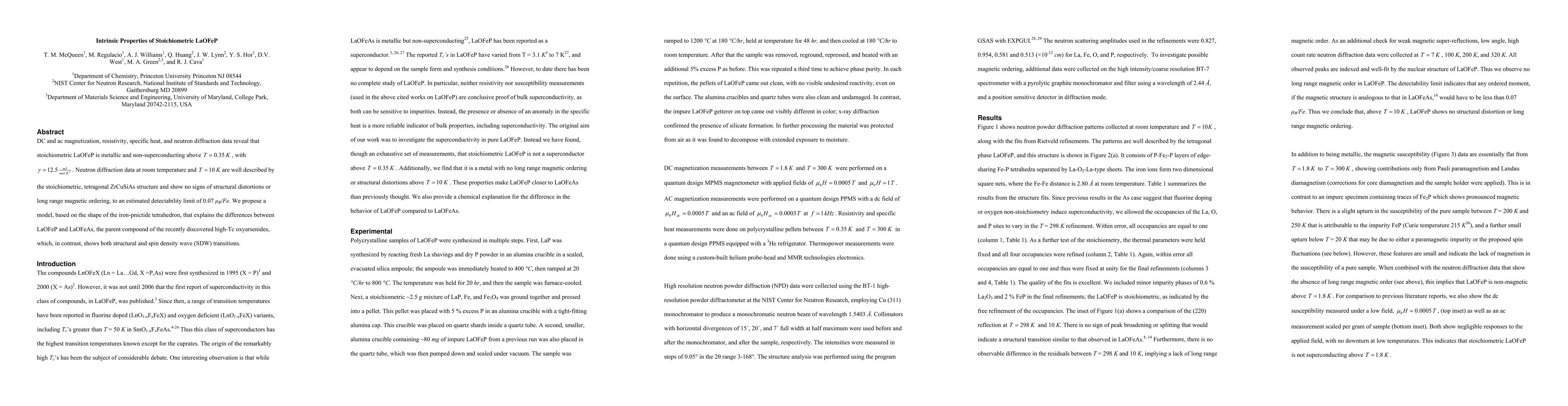 LaOFeP is metallic and non-superconducting above 0.35 K, with no structural distortions or long-range magnetic ordering, as shown by neutron diffraction. The differences between LaOFeP and its parent compound LaOFeAs are explained by the iron-pnictide tetrahedron shape.