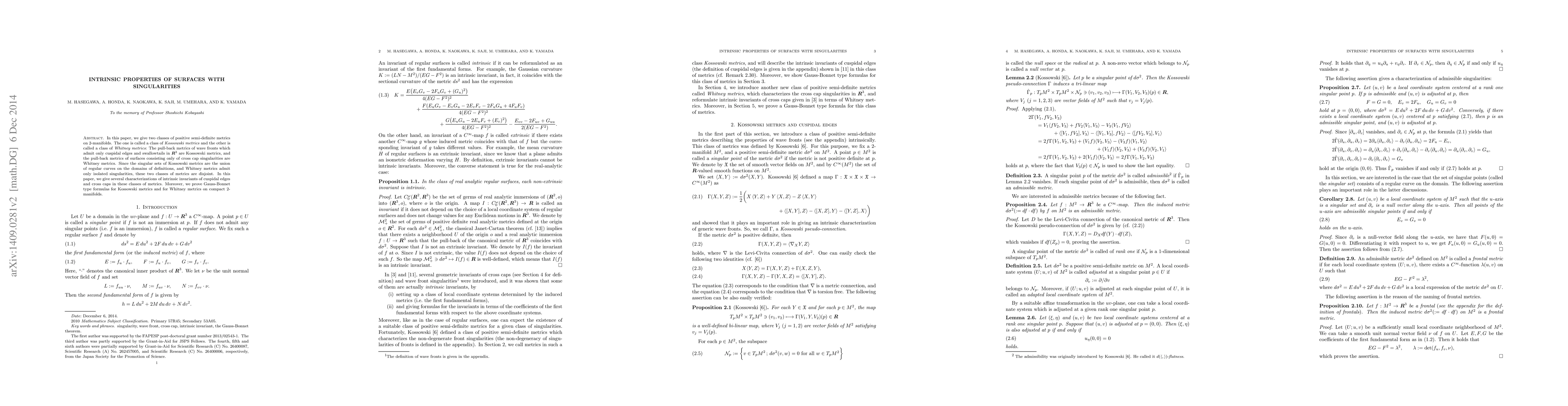 In this paper, we give two classes of positive semi-definite metrics on 2-manifolds. The one is called a class of Kossowski metrics and the other is called a class of Whitney metrics: The pull-back metrics of wave fronts which admit only cuspidal edges and swallowtails in $\boldsymbol{R}^3$ are Kossowski metrics, and the pull-back metrics of surfaces consisting only of cross cap singularities are Whitney metrics. Since the singular sets of Kossowski metrics are the union of regular curves on the domains of definitions, and Whitney metrics admit only isolated singularities, these two classes of metrics are disjoint. In this paper, we give several characterizations of intrinsic invariants of cuspidal edges and cross caps in these classes of metrics. Moreover, we prove Gauss-Bonnet type formulas for Kossowski metrics and for Whitney metrics on compact 2-manifolds.