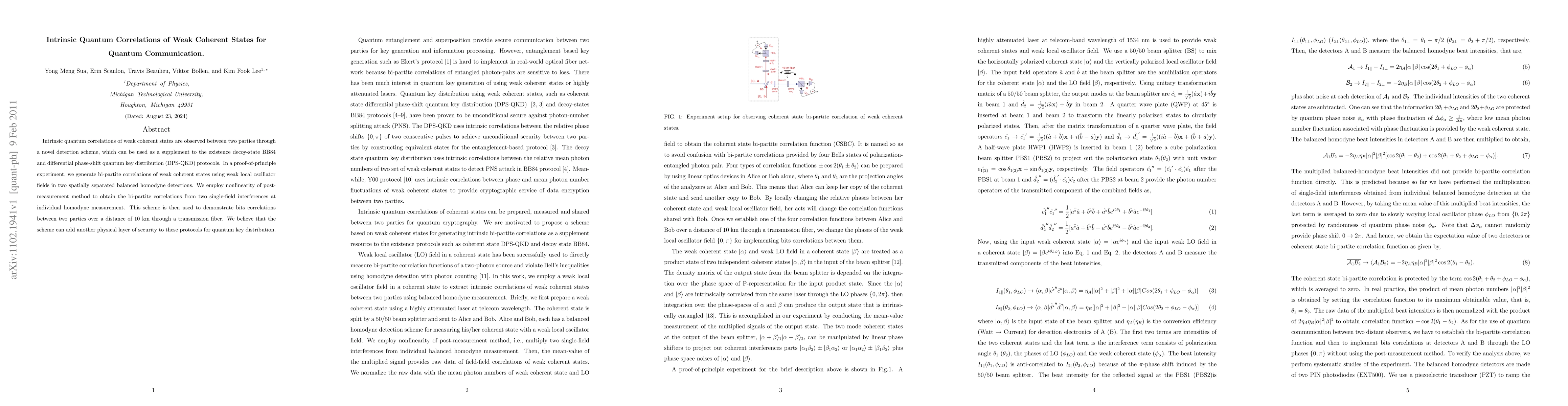 Intrinsic quantum correlations of weak coherent states are observed between two parties through a novel detection scheme, which can be used as a supplement to the existence decoy-state BB84 and differential phase-shift quantum key distribution (DPS-QKD) protocols. In a proof-of-principle experiment, we generate bi-partite correlations of weak coherent states using weak local oscillator fields in two spatially separated balanced homodyne detections. We employ nonlinearity of post-measurement method to obtain the bi-partite correlations from two single-field interferences at individual homodyne measurement. This scheme is then used to demonstrate bits correlations between two parties over a distance of 10 km through a transmission fiber. We believe that the scheme can add another physical layer of security to these protocols for quantum key distribution.