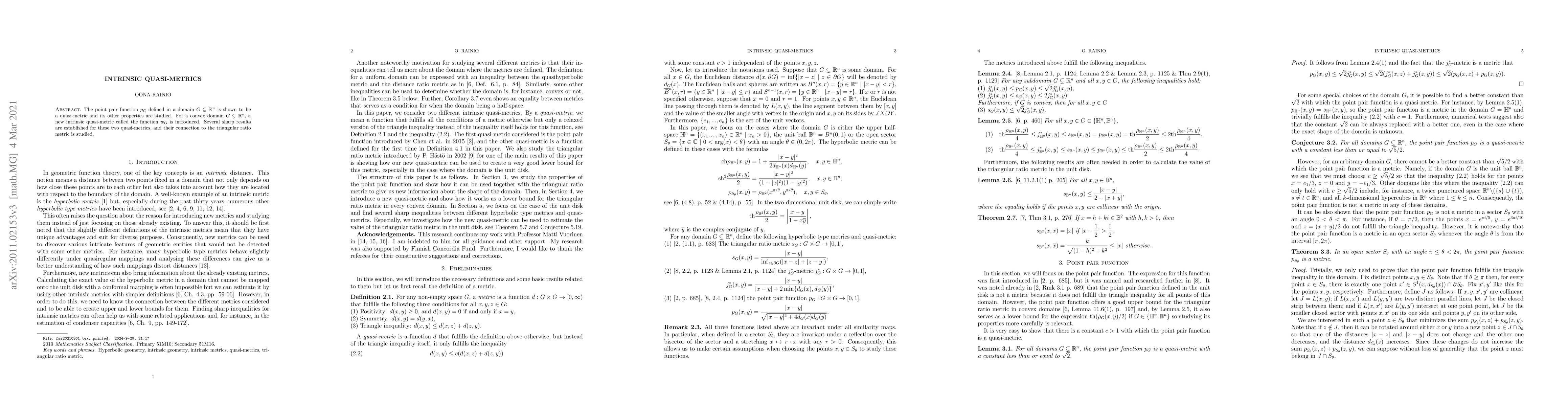 The point pair function $p_G$ defined in a domain $G\subsetneq\mathbb{R}^n$ is shown to be a quasi-metric and its other properties are studied. For a convex domain $G\subsetneq\mathbb{R}^n$, a new intrinsic quasi-metric called the function $w_G$ is introduced. Several sharp results are established for these two quasi-metrics, and their connection to the triangular ratio metric is studied.
