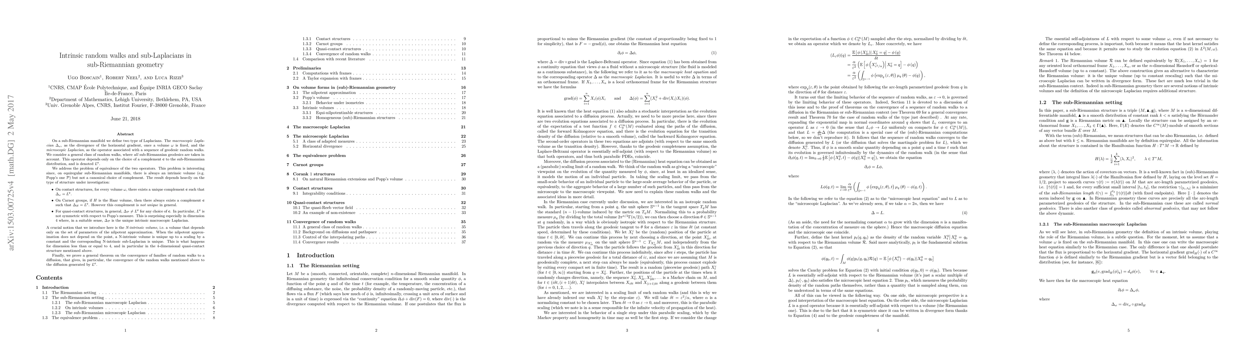 On a sub-Riemannian manifold we define two type of Laplacians. The \emph{macroscopic Laplacian} $\Delta_\omega$, as the divergence of the horizontal gradient, once a volume $\omega$ is fixed, and the \emph{microscopic Laplacian}, as the operator associated with a sequence of geodesic random walks. We consider a general class of random walks, where \emph{all} sub-Riemannian geodesics are taken in account. This operator depends only on the choice of a complement $\mathbf{c}$ to the sub-Riemannian distribution, and is denoted $L^c$. We address the problem of equivalence of the two operators. This problem is interesting since, on equiregular sub-Riemannian manifolds, there is always an intrinsic volume (e.g. Popp's one $P$) but not a canonical choice of complement. The result depends heavily on the type of structure under investigation. On contact structures, for every volume $\omega$, there exists a unique complement $c$ such that $\Delta_\omega=L^c$. On Carnot groups, if $H$ is the Haar volume, then there always exists a complement $c$ such that $\Delta_H=L^c$. However this complement is not unique in general. For quasi-contact structures, in general, $\Delta_P \neq L^c$ for any choice of $c$. In particular, $L^c$ is not symmetric w.r.t. Popp's measure. This is surprising especially in dimension 4 where, in a suitable sense, $\Delta_P$ is the unique intrinsic macroscopic Laplacian. A crucial notion that we introduce here is the N-intrinsic volume, i.e. a volume that depends only on the set of parameters of the nilpotent approximation. When the nilpotent approximation does not depend on the point, a N-intrinsic volume is unique up to a scaling by a constant and the corresponding N-intrinsic sub-Laplacian is unique. This is what happens for dimension smaller or equal than 4, and in particular in the 4-dimensional quasi-contact structure mentioned above.