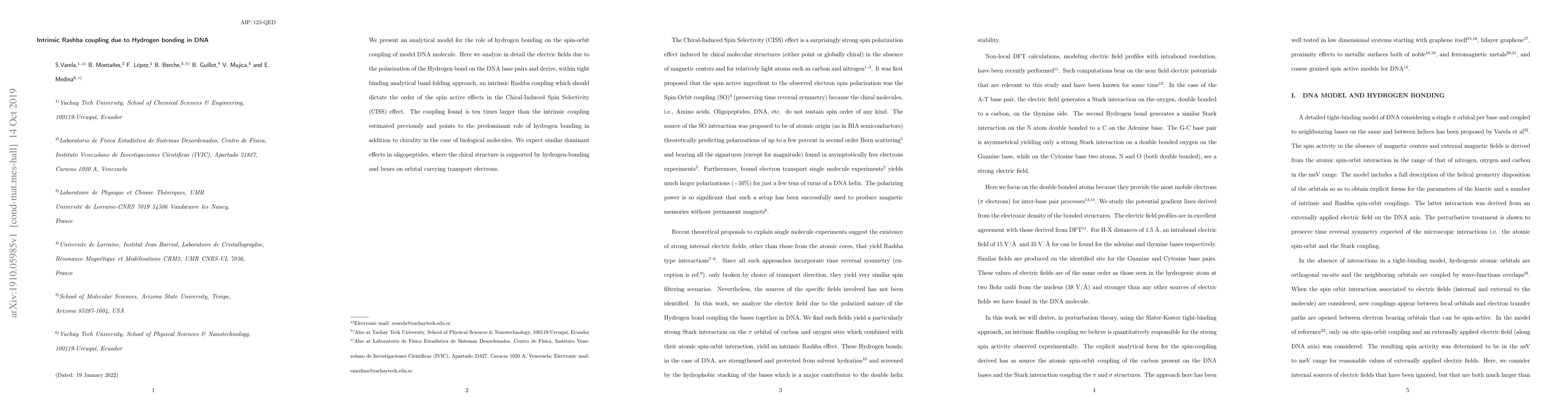 We present an analytical model for the role of hydrogen bonding on the spin-orbit coupling of model DNA molecule. Here we analyze in detail the electric fields due to the polarization of the Hydrogen bond on the DNA base pairs and derive, within tight binding analytical band folding approach, an intrinsic Rashba coupling which should dictate the order of the spin active effects in the Chiral-Induced Spin Selectivity (CISS) effect. The coupling found is ten times larger than the intrinsic coupling estimated previously and points to the predominant role of hydrogen bonding in addition to chirality in the case of biological molecules. We expect similar dominant effects in oligopeptides, where the chiral structure is supported by hydrogen-bonding and bears on orbital carrying transport electrons.