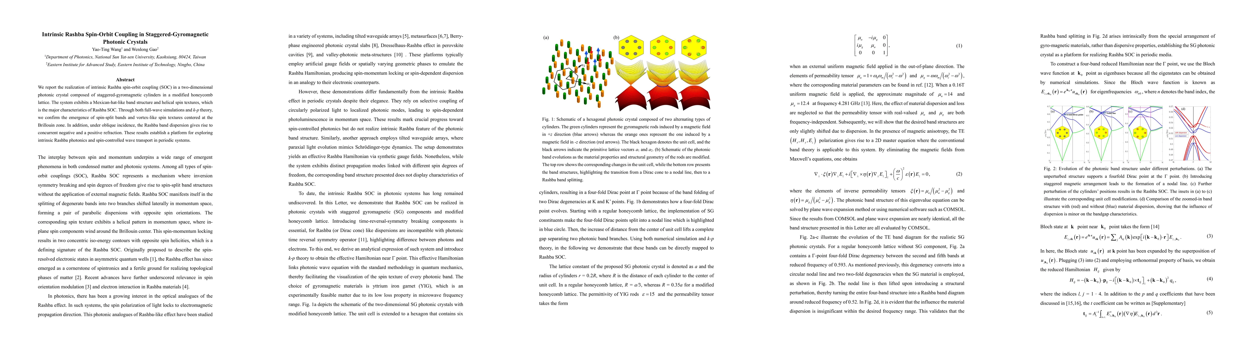 We report the realization of intrinsic Rashba spin-orbit coupling (SOC) in a two-dimensional photonic crystal composed of staggered-gyromagnetic cylinders in a modified honeycomb lattice. The system exhibits a Mexican-hat-like band structure and helical spin textures, which is the major characteristics of Rashba SOC. Through both full-wave simulations and k-p theory, we confirm the emergence of spin-split bands and vortex-like spin textures centered at the Brillouin zone. In addition, under oblique incidence, the Rashba band dispersion gives rise to concurrent negative and a positive refraction. These results establish a platform for exploring intrinsic Rashba photonics and spin-controlled wave transport in periodic systems.