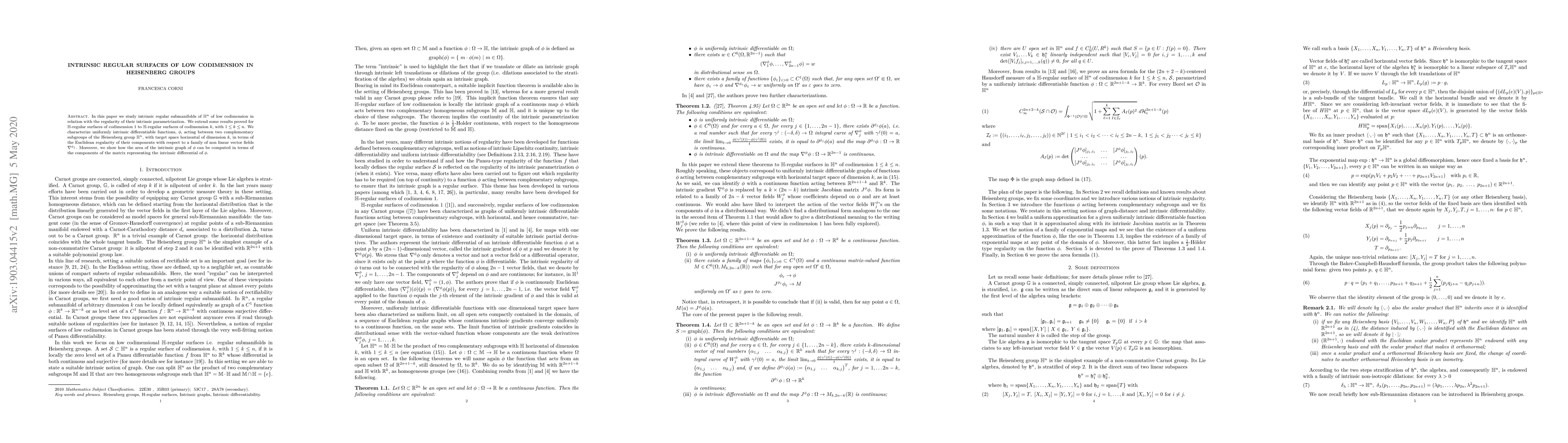 In this paper we study intrinsic regular submanifolds of $\mathbb{H}^n$, of low co-dimension in relation with the regularity of their intrinsic parametrization. We extend some results proved for one co-dimensional $\mathbb{H}$-regular surfaces, characterizing uniformly intrinsic differentiable functions $\phi$ acting between two complementary subgroups of the Heisenberg group $\mathbb{H}^n$, with target space horizontal of dimension $k$, with $1 \leq k \leq n$, in terms of the Euclidean regularity of its components with respect to a family of non linear vector fields $\nabla^{\phi_j}$. Moreover, we show how the area of the intrinsic graph of $\phi$ can be computed through the component of the matrix identifying the intrinsic differential of $\phi$.