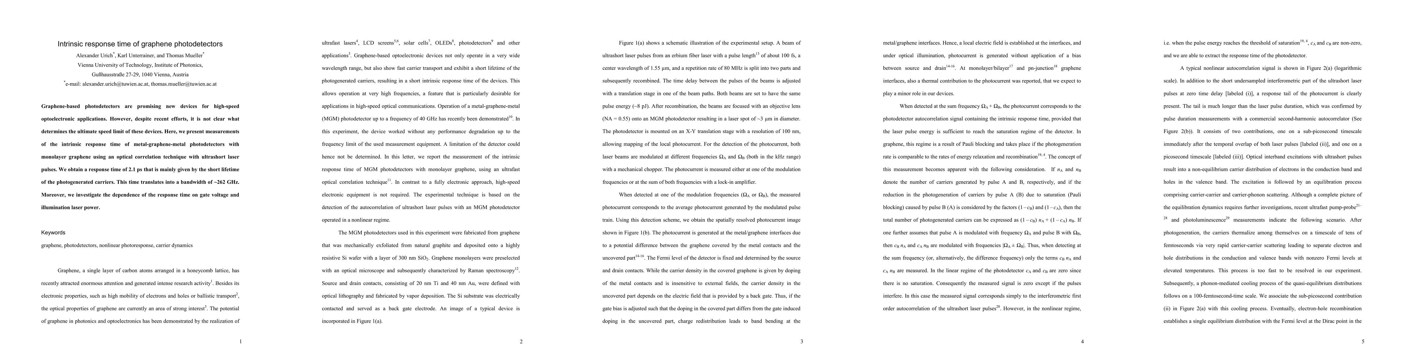 This study measures the intrinsic response time of graphene photodetectors, finding a speed limit of 2.1 ps primarily due to the short lifetime of photogenerated carriers, translating to a bandwidth of ~262 GHz. The research also explores how gate voltage and laser power affect the response time.