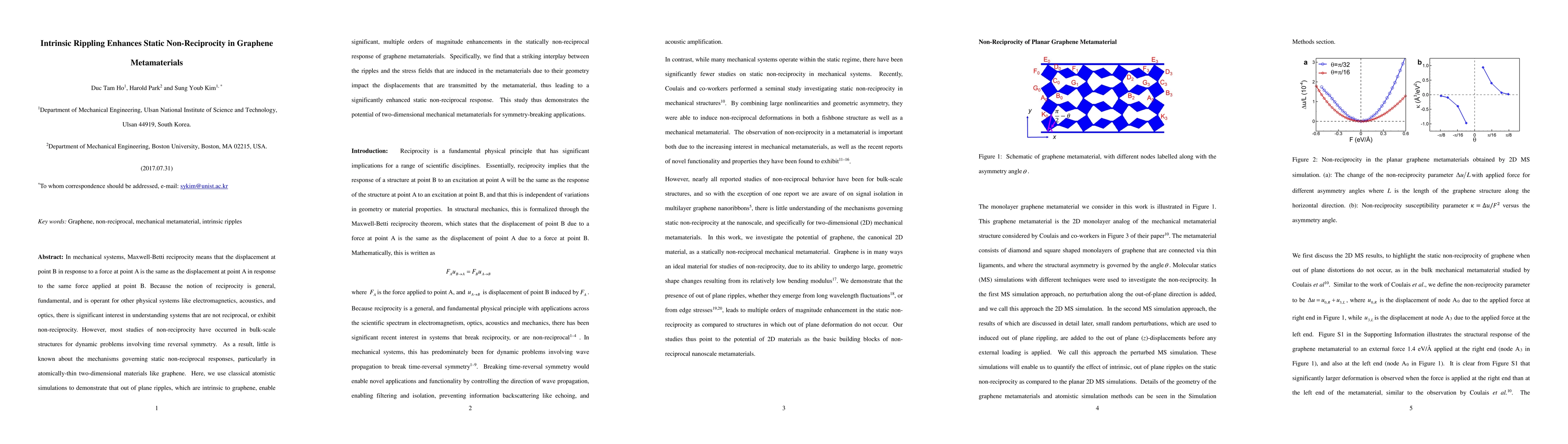 This paper demonstrates that intrinsic out-of-plane ripples in graphene enhance static non-reciprocity in graphene metamaterials through an interplay between the ripples and induced stress fields. This finding reveals the potential of two-dimensional mechanical metamaterials for applications requiring symmetry-breaking.