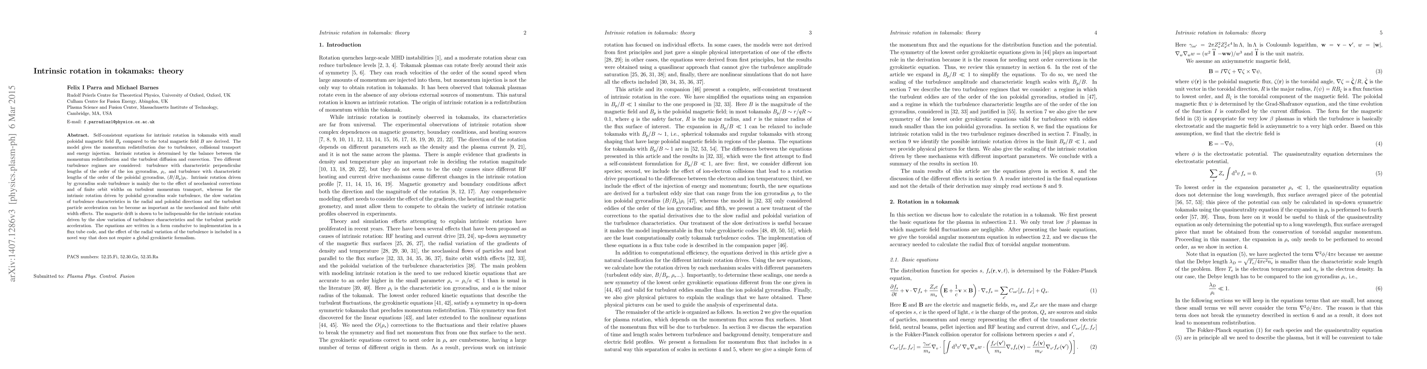 This paper derives self-consistent equations for intrinsic rotation in tokamaks, considering turbulence and collisional transport. It identifies two turbulence regimes affecting intrinsic rotation, emphasizing the role of magnetic drift and turbulence characteristics in determining rotation dynamics.