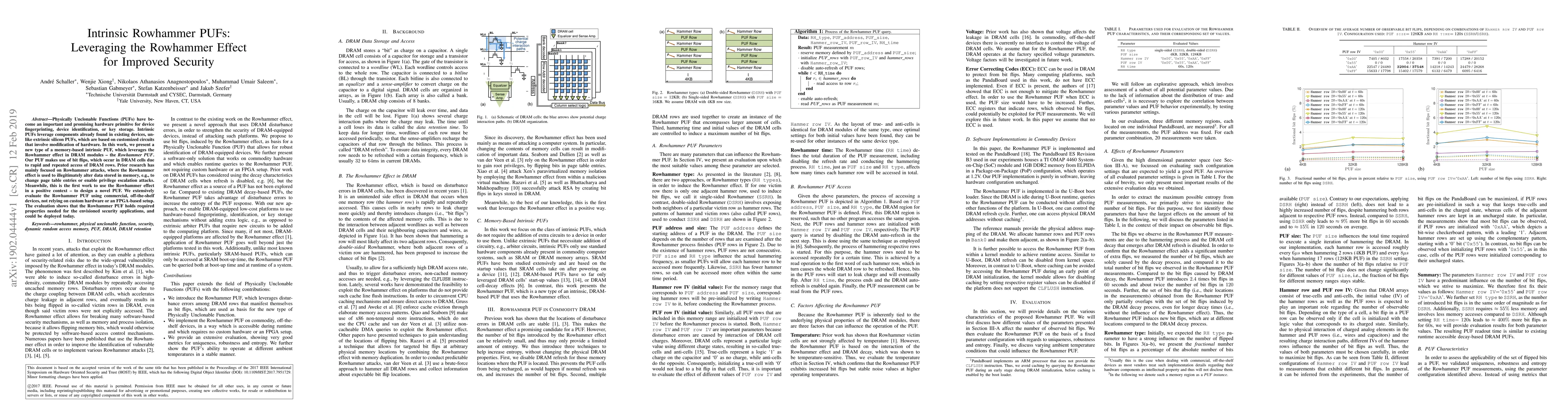 The Rowhammer PUF, a novel memory-based intrinsic PUF leveraging the Rowhammer effect in DRAM modules for device authentication or cryptographic key storage.