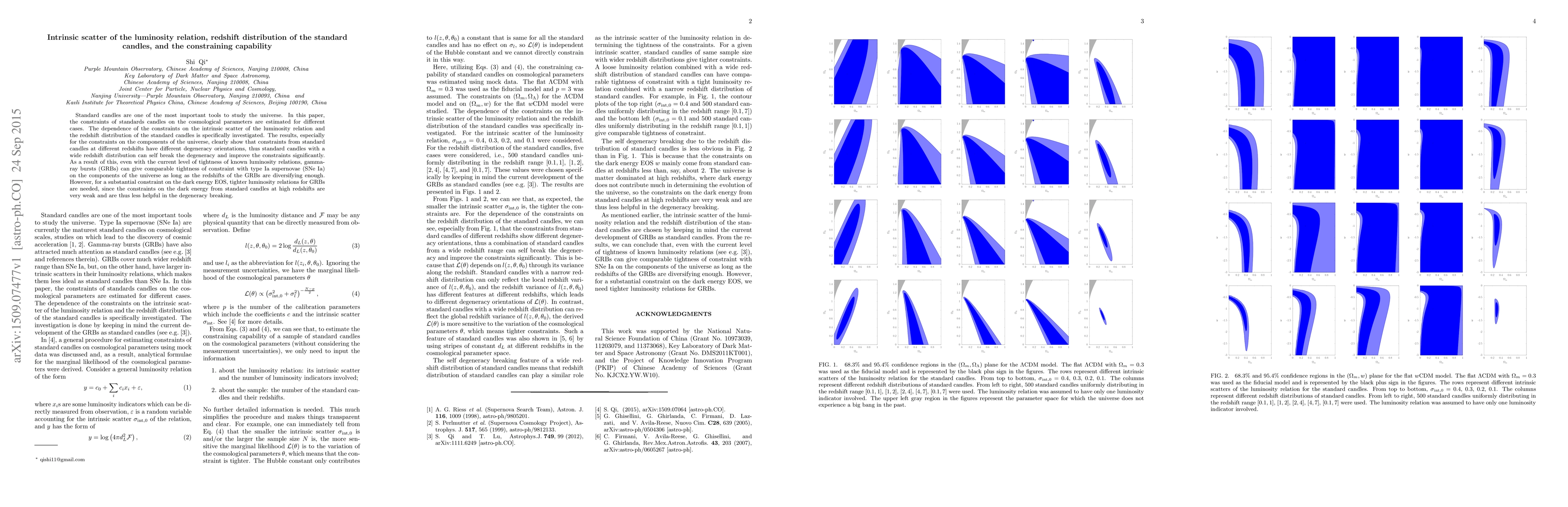 This paper investigates the impact of intrinsic scatter in luminosity relations and the redshift distribution of standard candles on cosmological parameter constraints. It finds that a wide redshift distribution of standard candles can significantly improve constraints and break degeneracies, making GRBs comparable to SNe Ia for certain parameters, though tighter luminosity relations for GRBs are needed for substantial constraints on dark energy.