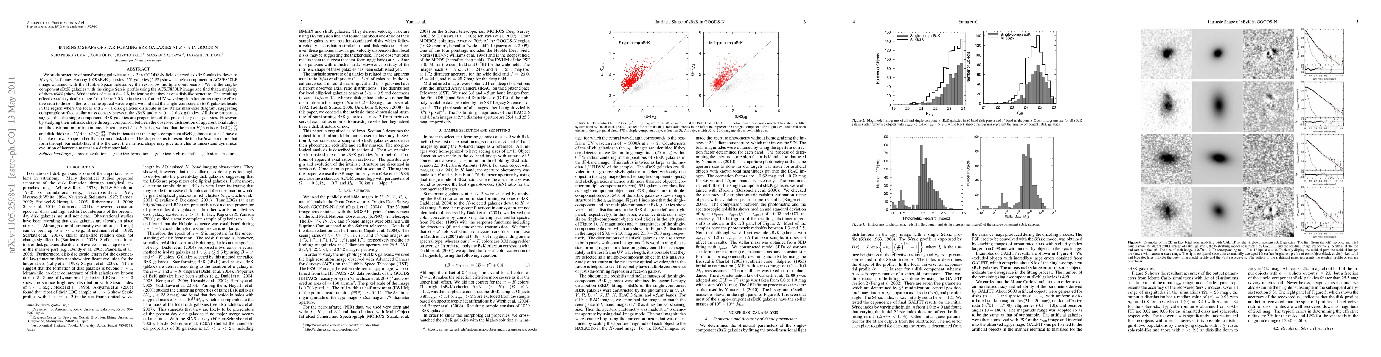 We study structure of star-forming galaxies at z~2 in GOODS-N field selected as sBzK galaxies down to K_{AB} <24.0 mag. Among 1029 sBzK galaxies, 551 galaxies (54%) show a single component in ACS/F850LP image obtained with the Hubble Space Telescope; the rest show multiple components. We fit the single-component sBzK galaxies with the single S\'ersic profile using the ACS/F850LP image and find that a majority of them (64%) show S\'ersic index of n=0.5-2.5, indicating that they have a disk-like structure. The resulting effective radii typically range from 1.0 to 3.0 kpc in the rest-frame UV wavelength. After correcting the effective radii to those in the rest-frame optical wavelength, we find that the single-component sBzK galaxies locate in the region where the local and z~1 disk galaxies distribute in the stellar mass-size diagram, suggesting comparable surface stellar mass density between the sBzK and z~0-1 disk galaxies. All these properties suggest that the single-component sBzK galaxies are progenitors of the present-day disk galaxies. However, by studying their intrinsic shape through comparison between the observed distribution of apparent axial ratios and the distribution for triaxial models with axes (A>B>C), we find that the mean B/A ratio is 0.61^{+0.05}_{-0.08} and disk thickness C/A is 0.28^{+0.03}_{-0.04}. This indicates that the single-component sBzK galaxies at z~2 have a bar-like or oval shape rather than a round disk shape. The shape seems to resemble to a bar/oval structure that form through bar instability; if it is the case, the intrinsic shape may give us a clue to understand dynamical evolution of baryonic matter in a dark matter halo.