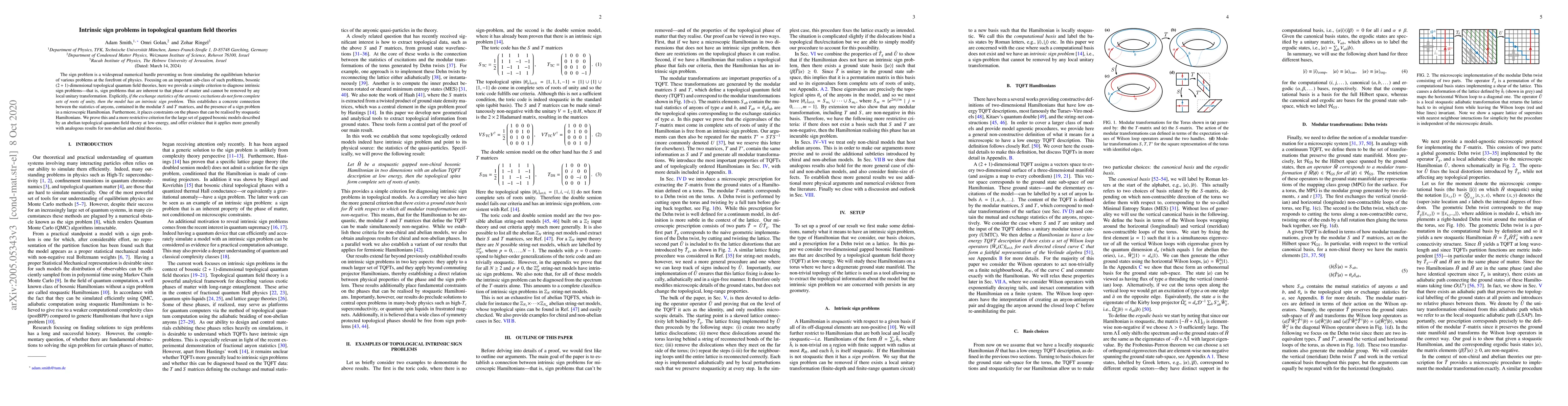 This paper identifies intrinsic sign problems in bosonic $(2+1)$-dimensional topological quantum field theories by establishing a criterion: if the anyonic excitations' exchange statistics do not form complete sets of roots of unity, an intrinsic sign problem exists. This insight connects the statistics of anyons to the presence of sign problems in microscopic Hamiltonians and constrains realizable phases in stoquastic Hamiltonians.
