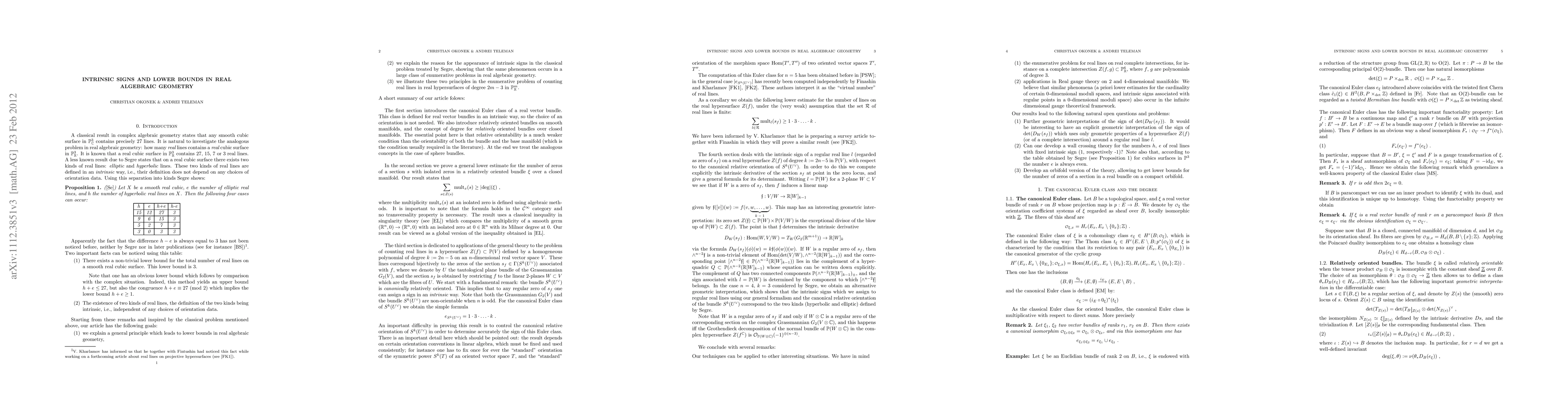 Summary: This paper explores intrinsic classifications and lower bounds in real algebraic geometry, focusing on Segre's classical result about real lines on cubic surfaces. It introduces a general principle to derive lower bounds and demonstrates intrinsic signs in a broad range of enumerative problems, illustrated through the enumerative problem of real lines on hypersurfaces of degree $2m-3$ in ${\mathbb P}^m_\R$.