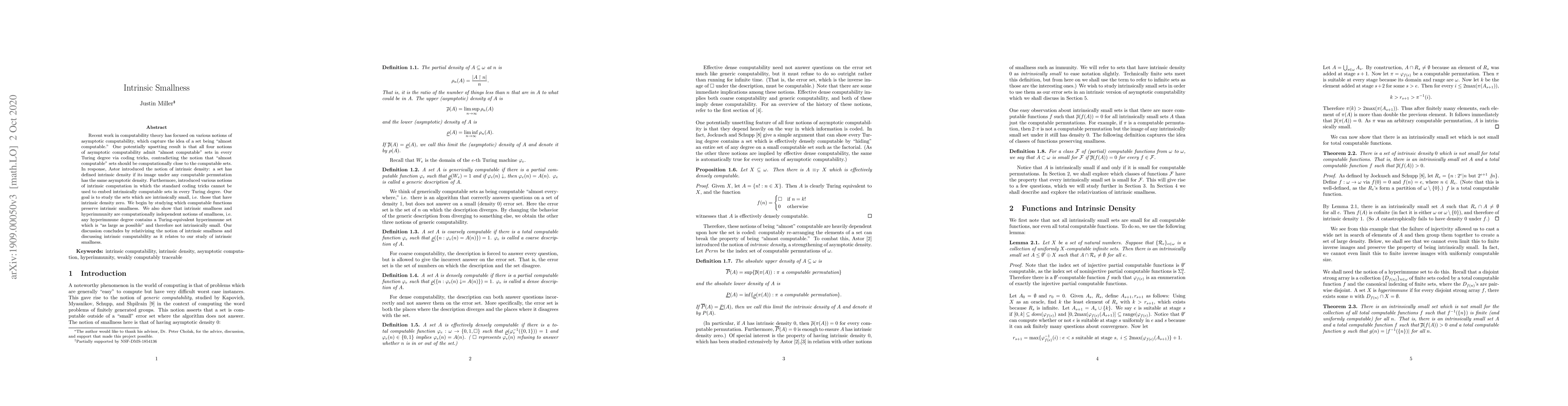 This paper explores the concept of intrinsic smallness in computability theory, focusing on sets with intrinsic density zero. It investigates computable functions that preserve intrinsic smallness and demonstrates the computational independence of intrinsic smallness and hyperimmunity.