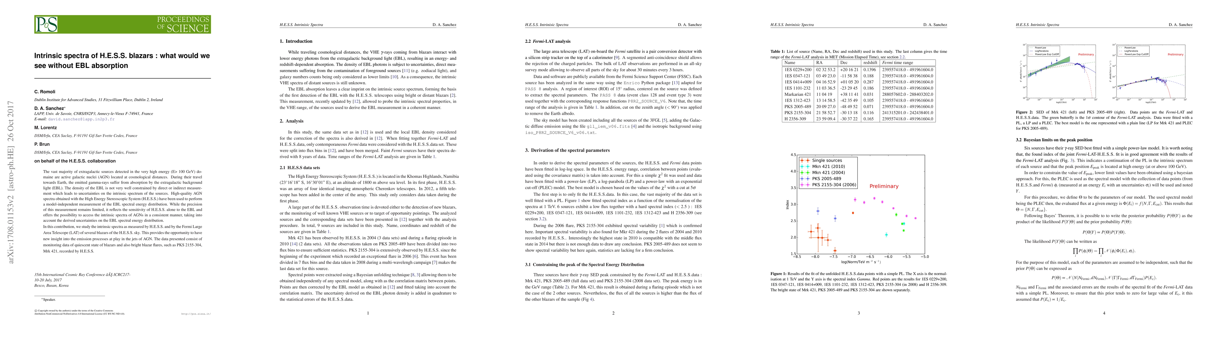 The vast majority of extragalactic sources detected in the very high energy (E> 100 GeV) domaine are active galactic nuclei (AGN) located at cosmological distances. During their travel towards Earth, the emitted gamma-rays suffer from absorption by the extragalactic background light (EBL). The density of the EBL is not very well constrained by direct or indirect measurement which leads to uncertainties on the intrinsic spectrum of the sources. High-quality AGN spectra obtained with the High Energy Stereoscopic System (H.E.S.S.) have been used to perform a model-independent measurement of the EBL spectral energy distribution. While the precision of this measurement remains limited, it reflects the sensitivity of H.E.S.S. alone to the EBL and offers the possibility to access the intrinsic spectra of AGNs in a consistent manner, taking into account the derived uncertainties on the EBL spectral energy distribution. In this contribution, we study the intrinsic spectra as measured by H.E.S.S. and by the Fermi Large Area Telescope (LAT) of several blazars of the H.E.S.S. sky. This provides the opportunity to have new insight into the emission processes at play in the jets of AGN. The data presented consist of monitoring data of quiescent state of blazars and also bright blazar flares, such as PKS~2155-304, Mrk~421, recorded by H.E.S.S.