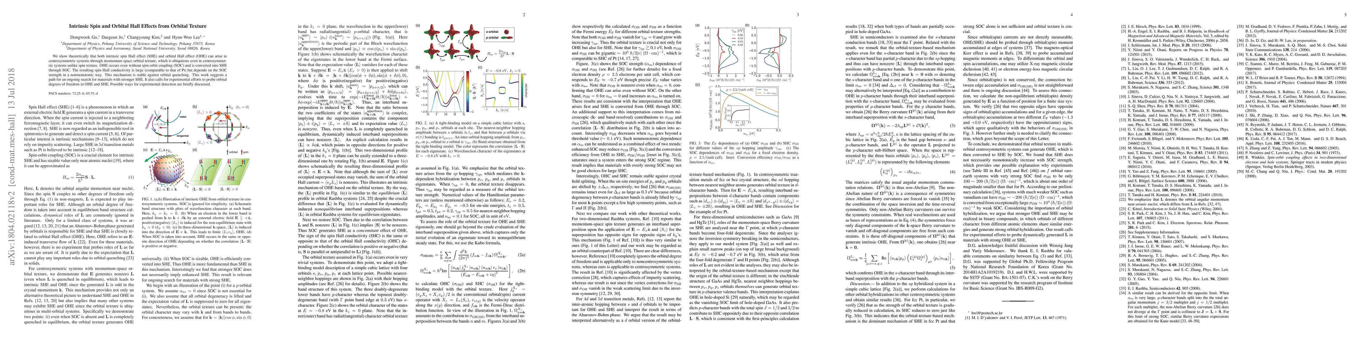 This paper theoretically demonstrates that intrinsic spin and orbital Hall effects can emerge in centrosymmetric systems via orbital texture, which is common even without spin-orbit coupling. The orbital Hall effect is converted into the spin Hall effect through spin-orbit coupling, resulting in significant spin Hall conductivity.