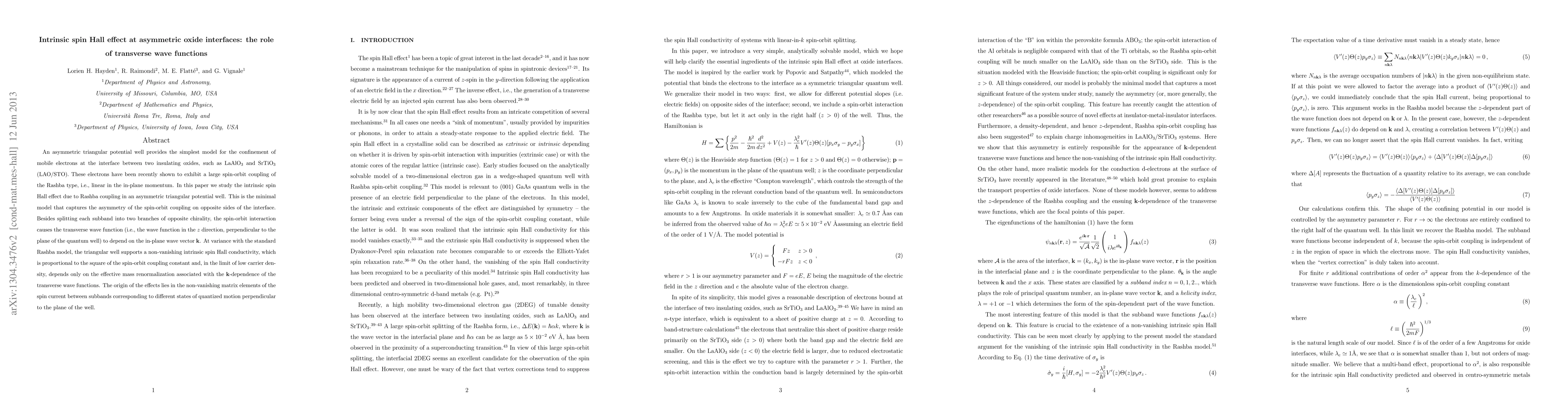 An asymmetric triangular potential well provides the simplest model for the confinement of mobile electrons at the interface between two insulating oxides, such as LaAlO_3 and SrTiO_3 (LAO/STO). These electrons have been recently shown to exhibit a large spin-orbit coupling of the Rashba type, i.e., linear in the in-plane momentum. In this paper we study the intrinsic spin Hall effect due to Rashba coupling in an asymmetric triangular potential well. Besides splitting each subband into two branches of opposite helicity, the spin-orbit interaction causes the wave function in the direction perpendicular to the plane of the quantum well (the z direction) to depend on the in-plane wave vector k. In contrast to the extreme asymmetric case, i.e., the wedge-shaped quantum well, for which the intrinsic spin Hall effect vanishes due to vertex corrections, we find that the asymmetric well supports a non-vanishing intrinsic spin Hall conductivity, which increases in magnitude as the well becomes more symmetric. The spin Hall conductivity is found to be proportional to the square of the spin-orbit coupling constant and, in the limit of low carrier density, depends only on the effective mass renormalization associated with the k-dependence of the wave functions in the z direction. Its origin lies in the non-vanishing matrix elements of the spin current between subbands corresponding to different states of quantized motion perpendicular to the plane of the well.